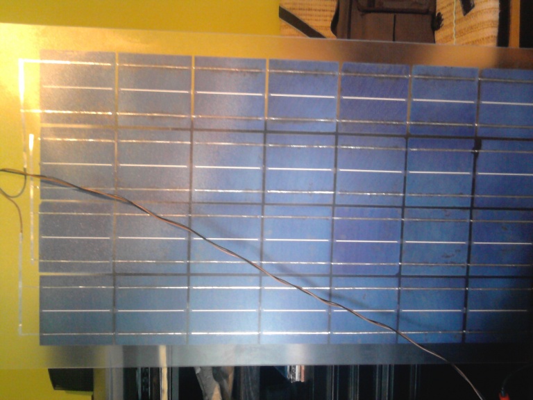 Elkészült az első napelemem. Nem is volt olyan szörnyű forrasztani a cellákat. Legalábbis ami megsérült az nem a forrasztáskor sérült meg hanem a kezemben tört le a sarka. Valami keretet kell még csinálnom neki meg szilikonnal le tömíteni.
