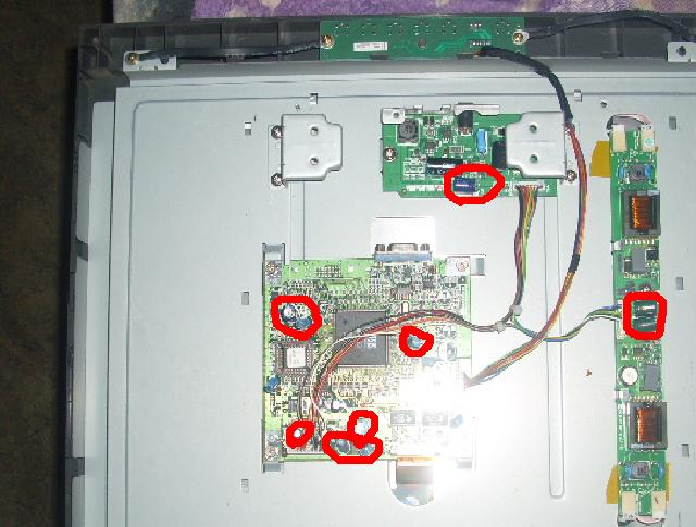 Nálam egy F-17C járt, ami belül nem pont ugyan így néz ki, mint a tied, viszont hasonlóan csíkozott. Az NT68521 közelében levő egyik 10u 16V kondi cseréje megoldotta.