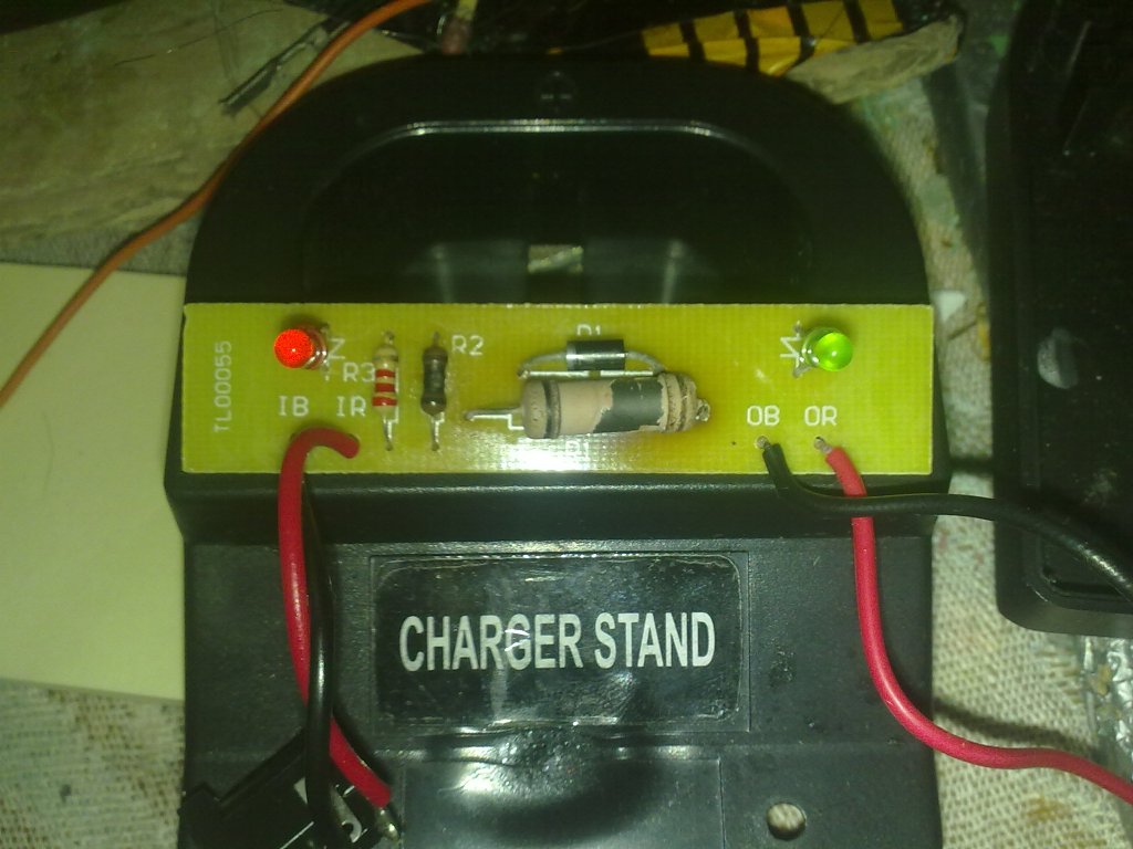 Ez az egyszerű kapcsolás úgy működött a tervező elképzelése szerint, hogy az R1 korlátozza a töltőáramot, és ha az R1-en a Led nyitófeszültsége alá csökkent a feszültség a töltőáram csökkenése miatt, kialszik a Led. Persze ez nem egy határozott dolog. De az aksit feltöltöttségi szintjét úgy sem lehet pontosan a töltési végfeszültsége alapján megállapítani, sok jelentősége nincs. Minden esetre a Led kb. 2,2V nyitófeszültsége miatt ez a "töltést jelző megoldás" csak akkor használható, ha a töltő minimum 2,5V többletfeszültséggel rendelkezik, mint az akis(v. pakk) maximális feszültsége.
