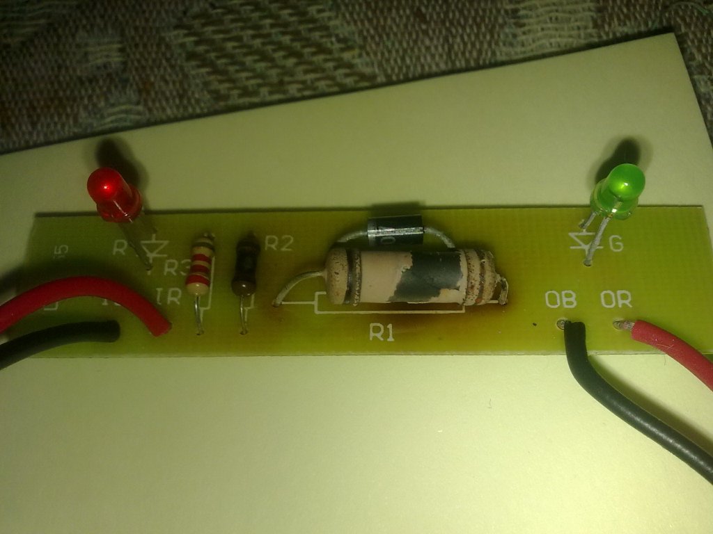 Mivel Te vagy erről "fúrtál" aksi nélkül, vagy rövidre zártad, R1 leéget, és mivel így a zöld Led-re jókora feszültség jutott, az R2 is erre a sorsra jutott. Viszont előfordulhat, hogy a zöld Led is megadta magát, a túláramtól. (De minimum a fénye lesz a töredéke.)