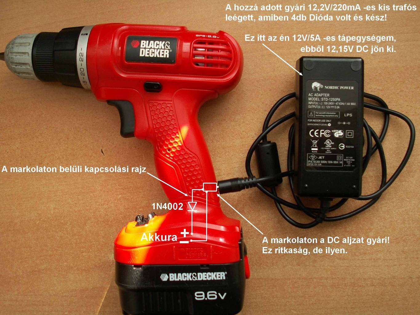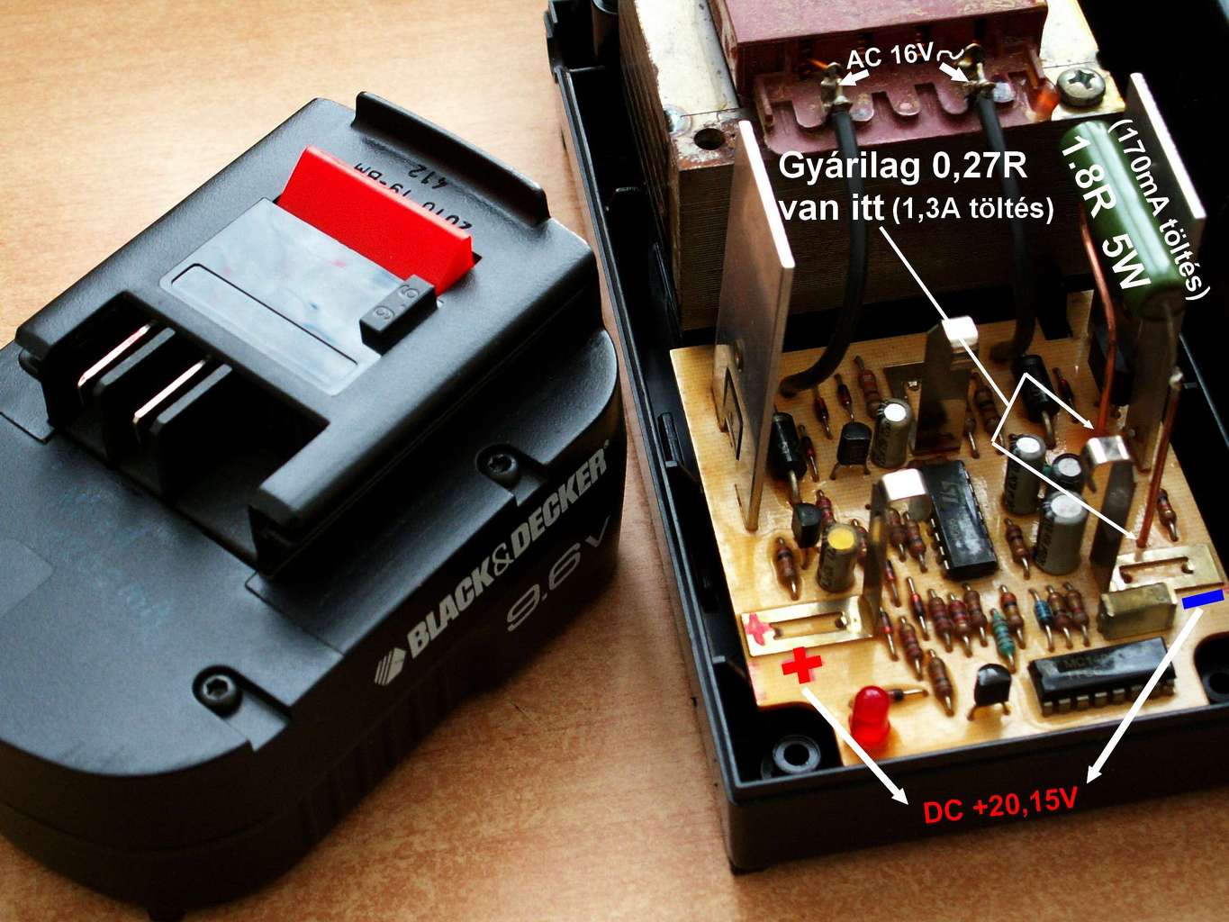 Kaptam egy Black&Decker csavar behajtót, aminek 9,6V-os, 1200mA-es NiCd akkuja teljesen le volt merülve. Mivel a gyári hozzáadott töltőjében ami 12,2 Volt és 220mA -es, leégett a "pindurka" trafó, - amúgy ezen kívül csak 4db 1 Amperes egyenirányító dióda van - ezért elkezdtem feltölteni egy 12V/5A stabil kapcs.üzemü tápegységgel úgy, hogy sorba kötöttem egy 10 Ohmos, 10 Wattos ellenállást. Nagy pontosságú multiméterrel (1500 Ft-os nem biztos, hogy jó) 15 percenként mértem az akku feszt és mikor elérte a 11,2 Voltot, (8x1,4V) befejeztem a töltést. Töltési időt és áramerősséget nem mértem közben - tudom, nem szép dolog - de az akku végig "hideg" maradt. Vissza jött bele egy kis erő. Annyi, hogy fúró állásba állítva le tudtam fogni, de "20-as leracsnizóra" tekerve elforgott. Ez után a saját motorjával lemerítettem (nem terhelve, ill. erőltetve) 8 Voltig. Ismét töltőre tettem, de most egy Bosch 2 607 224 típusúra, ami 7,2V---12V -ig, 1,3A -al tölt. Persze csak krokodilcsipeszes kábelekkel megoldva. A töltő +/_ érintkezőjén kívül van egy 3. is amin valószínű, hogy azt érzi, van e rajta akkumulátor. Mivel a szóbanforgó akkupakkban semmi passzív, aktív alkatrész nincs, ezért kívűlről a negatívról lehozva, egy 3,9K Ohmos ellenállaton át kötöttem a 3. töltő érintkezőre és egyszerre elkezdett tölteni. Kiváncsi voltam, illetve vagyok, (ha megengeditek a végén kérdezek) honnan tudja a töltö, hogy 7,2V - 9,6V - 12V -os akku van e rajt. Ezért a 3,9K ellenállást kicseréltem 10K -s potenció méterre. A poti csúszkáját az akku minussza felé tekerve elaludt a piros töltést jelző LED, pontosan 2,3 KOhm elérésekor így a töltés is megszűnt. Visszatekerve, növelve a minusz és a töltő 3. érintkezője közt az ellenállást, ismét elkezdett tölteni, így a LED is ismét töltést jelzett. Ha mégsem indult el a töltés, akkor egy pillanatra megkellett szakítani a 3. érintkezővel a kontaktot és újra vissza, aztán már töltött is. A mellékelt képeken illusztrálom. A nálam jobban hozzáértőkhöz lenne néhány kérdésem: Honnan tudhatja a töltő, hogy hány voltos akkut tettek rá, talán mindegyiknek más 3. érintkezőre menő kontakt ellenállása lehet? Vagy az ellenállás értéke csak az akkut engedi tovább tölteni? A 12V/5A-es kapcs. tápegységem kimenetén pontosan 12,15 Volt stabil van, hány Ohmos ellenállás kellene, hogy 240mA -el töltsön? Az én számításom a következő: 12,15V ből 9,6V=2,55V osztva 0,240mA -al=10,625R kellene? Az ellenállás, vagy 12V/5W -os izzó jobb -e áramkorlátozó söntnek? Köszönöm, hogy elolvastátok és hogy válaszoltok a kérdéseimre! Üdv!