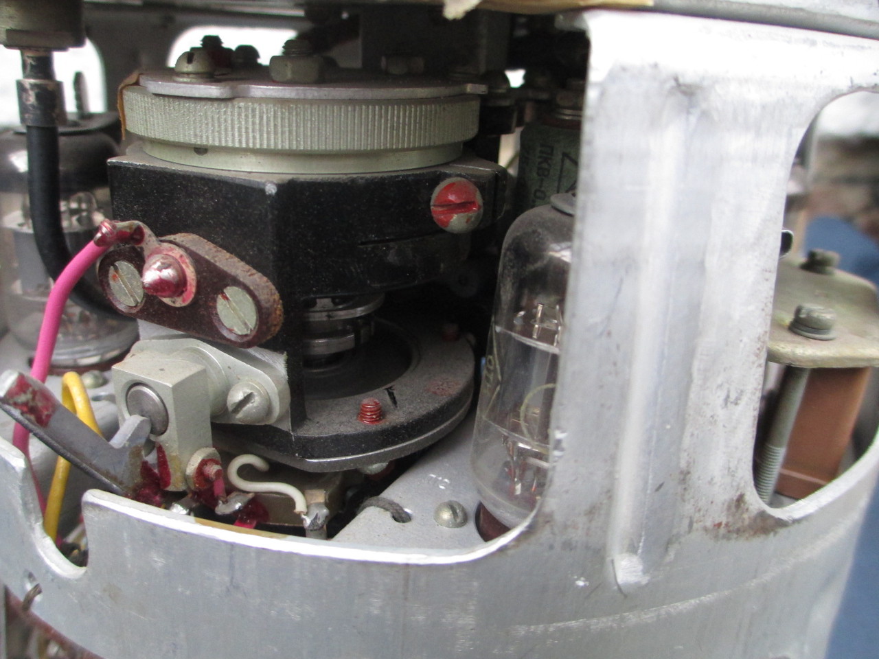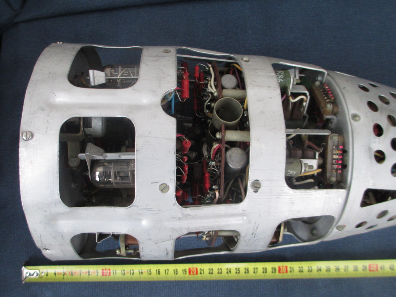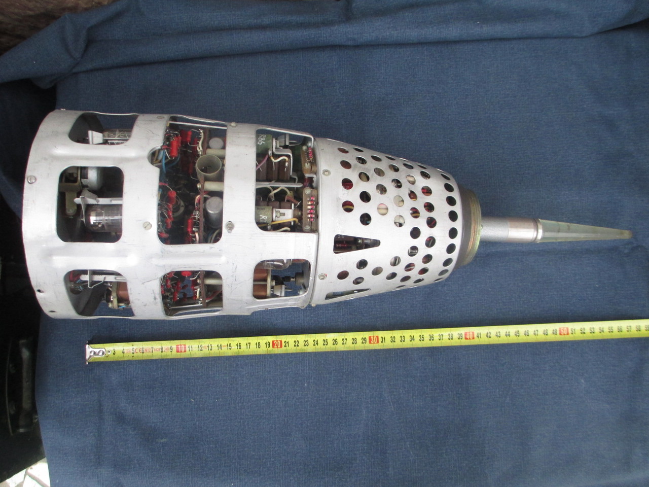 Orosz rakétavezérlő elektronika. 10GHz-es antenna/csőtápvonal, mikrohullámú csővel+ KF,és vezérlő elektronika. Teljesen csöves, novál,és "ceruza" csövekkel felépítve. Az alkatrészeken 1968-as dátumkód. Tipikus Orosz technika, jól összerakva.