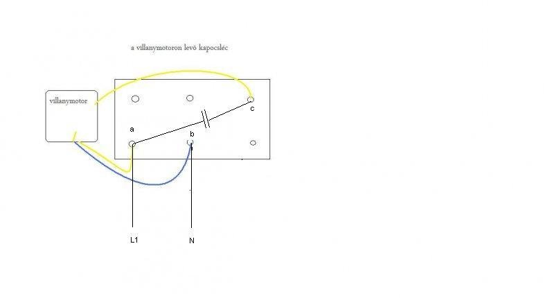 Először ellenőrizd ellenállásmérővel a tekercsellenállásokat. Keresd meg a legkisebb ellenállású tekercseket. Az én elképzelésem szerint ez "a" és "b" kivezetések között lesz. Ez a főtekercs. Ide kösd a 230V-ot. Azután a keresd meg a következő tekercset. Az én elképzelésem szerint ez "b" és "c" között lesz. Ez a segédtekercs. Akkor a kondit így kösd be. Ha a két tekercs egyforma ellenállású akkor a közös potjuk lesz a "b" azaz a nulla, a másik kettő küzül pedig mindegy, hogy melyikre kötöd a fázist illetve a kondit, de a forgásirány a szerint lesz "előre" vagy "hátra". Azaz attól függ a forgásirány. O.T. vége !!!