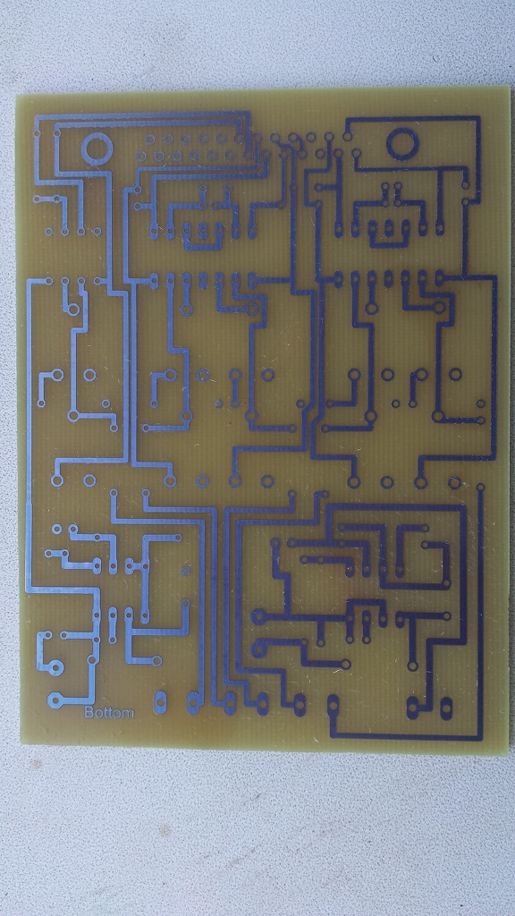 Az első próbálkozásom kudarcba fulladt, fele fele arányban kevertem a 30%-os savakat. Higítottam rajta vízzel, most 1/3 arányban használom kb. És a végeredmény nagyon szép lett, és nem legutolsó sorban 2 perc alatt megvan a marás. Pont ezzel volt a gondom, hogy kiszámíthatatlan volt a barna lötty, főleg minnél többet martam benne... Szóval a továbbiakban elfelejtem a jó öreg vas(III)-kloridot!
