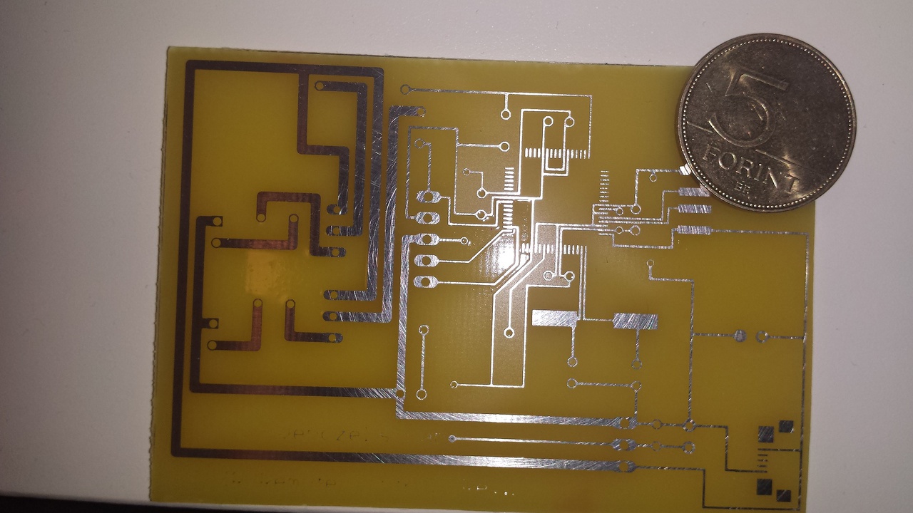 Sziasztok! Pár hónap kihagyás után csináltam ma egy nyákot. TQFP 0,5mm-es lábtávolsággal. Dry fóliával, nyomdai filmel, sósav + hidrogénpreoxid marással. Sajna a marató olyan erős lett, hogy 10 másodperc alatt lekapta. Kicsit alá mart meg a felirat teljesen megsemmisült, de amúgy simán jó lett