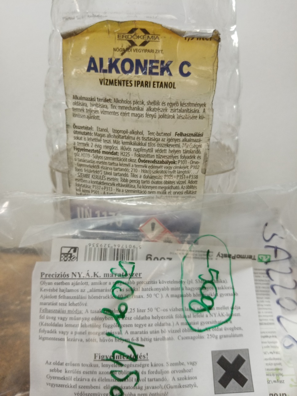 30% sósav és 30% peroxid volt. 5*10 cm panelnél nem volt még baj. Egy kicsit nagyobból kellett készítenem 30 darabot. Elkezdtem egymás után maratni, kb. a 10-12 után az oldat szinte felforrt, panel nélkül is tovább melegedett. A műanyag tál elkezdett kilapulni (emlékszik a préselés előtti formájára). Csak a második műanyag tál mentett meg. Azonnal higítottam vízzel... Nem történt "szökési esemény", sőt klórgáz szag sem volt.