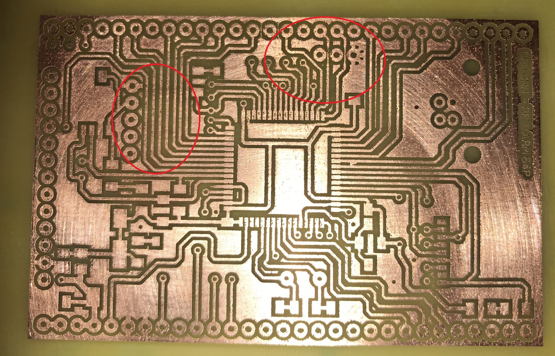 Valószínűleg a kicsit durvább polírpapír miatt, amit a festék leszedésére használtam vegyszer helyett. Vasalás előtt azért simább, és rendesen letisztítom polírozás után. Csináltam egy második marást. 35um helyett csak 18um-es a réz vastagság és nátrium-perszulfát helyett a gyorsmarót használtam hideg állapotában. Szabad szemmel sokkal jobb, használható is lesz, lakkozás és forrasztás után nem is vehető ki. Azért mindkettőről csináltam két nagyított képet. Így jobban látszik a felülete a réznek. A másodiknál sem tökéletes, de a rövidebb marási idő miatt (nem tartott 15 percig a marás) még használható állapotban maradt. Mindenesetre kiderült akkor hogy tényleg a nyomtató-toner okozza. Régóta tervezem hogy összerakok egy levilágítót. Jövőre alternatív megoldásnak esedékes lesz egyes nyákoknál átállni fotos technikára, ha tökéletest akarok. Illetve még annyi, hogy pár hónapja a CNC-s nyákmarás is megfordult a fejembe. Sok fajta megoldás létezik kisebb váz megépítésére. Voltaképp nincs is ezzel gond, adott lenne a mechanika és a elektronika is. De mindig jött más, és nem volt idő foglalkozni vele... Esetleg van itt olyasvalaki aki mart már nyákot CNC-vel? Látjátok értelmét havi 4-5 nyáknál vagy arra nagyon jó a vegyszeres marás is, és ne változtassak?
