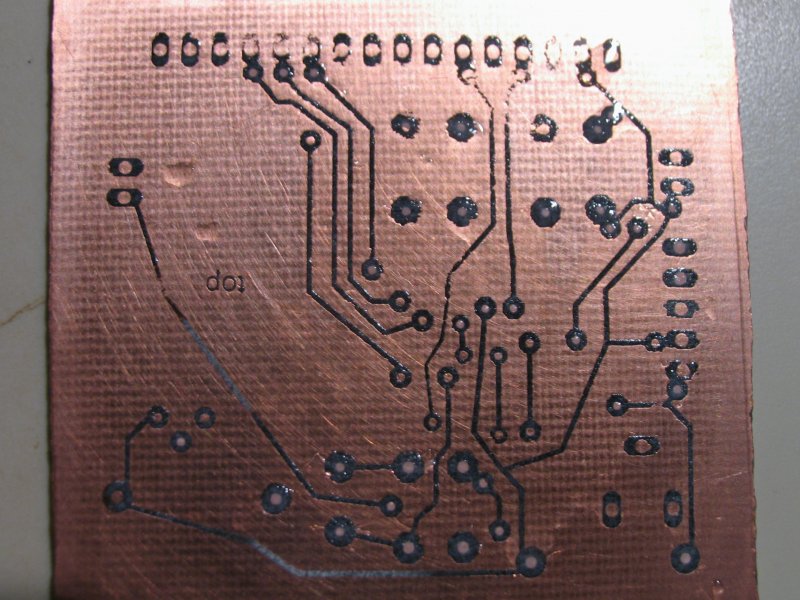 Igen, alacsony a fordulatszám, mert előtte műagyagot fúrtam, és nem volt kedvem átszerelni gyorsabbra, és tettem alá egy másik nyákot, azért van, hogy néhol nincs pereme. Csak azért raktam fel, hogy látszódjon hogy milyen szépen be lehet fogatni ezzel az ónozóval, és nincs korrózió. Mentségemre szolgáljon, hogy kétoldalas, paussz volt a maszk, és kicsi tasakot csináltam, és mikor összeraktam a két oldalt, akkor még fedésben volt, de azután megtűztem, hogy ne mozduljon el, és itt lett elrontva. A tűzés elhúzta egy kicsit, kb. fél mm-t, nehéz volt úgy fúrni, hogy mind a két oldal jó legyen. Mindezt éjfél után kezdtem. A maratásnál viszont most már nem a tesco 5-15%-os sósavat használtam, hanem rendes 20%-ost, döbbenetes volt a különbség! Az első másodpercekben zöldre váltott a lötyi, és kb. 2-3 perc volt. Ezzen annyira fellelkesültem, hogy gyorsan leónoztam, és nekiláttam kifúrni, annyira viszont már nem voltam lelkes, hogy átszereljem a fúrót. Éjjel megforrasztom (vagy holnap) azután lefotózom újra.