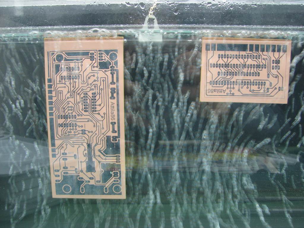 Ma végre élesen is kipróbáltam a maratókádamat, Attila86 által tervezett forrasztóállomás2 paneljait marattam benne. A 2,3 literes edényben kb 500g nátrium-perszulfát volt ( ennyit vettem kipróbálni )kb 30°C-os folyadékban a 2 panel nagyjából 20 perc alatt lett kész. A nyákot vasalással készítettem, nem sikerült 100%-osra pár helyen javítani kellett. A pozíció rajzot csak próba képen vasaltam fel, nem gondoltam volna hogy ennyire jól sikerül. A nátrium-perszulfátos maratót ajánlom mindenkinek, nekem bevált, nem egy gyors marató de nem fog meg semmit, nem büdös, lakásban is nyugodtan lehet használni.
