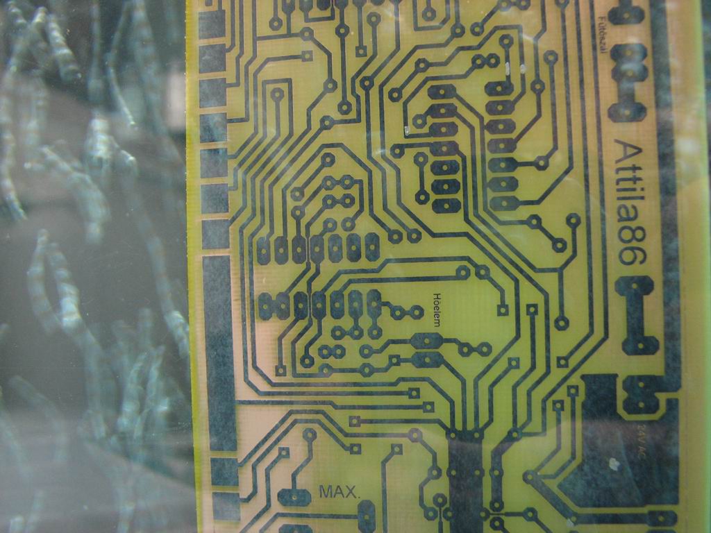 Nekem ez fehér izé lesz innentől fogva, amivel tegnap martam egy nyákot, 12*13 centis volt, több nyák rajz van rajta, még a fólia széle is megmaradt egy csomó helyen ahol ugye ferdén érte a fény, nem igazán tudom lemérni talán 0.1mm lehet. 21h körül raktam be a levilágítóba a panelt, 22:20 körülre volt lemarva. Ebből 20 perc volt a levilágítás meg az előhívás, mert találtam egy nyomdát 5 percre a melóhelyemtől, ahol a filmet aránylag olcsón előhívták, és olyan matt fekete lett mint a gyári filmek, merthogy azok is így készülnek, úgyhogy hagytam had világítson a led alaposan. A fehér izé akkor mar jól, ha melegen tartja az ember, lehet hogy a 40 perc marás gyorsabb lett volna ha végig melegítem. Melegvízbe raktam, nekiesett a réznek, pillanatok alatt lekapott belőle egy réteget, azután ahogy kihűlt a víz, úgy belassult. 25 perc után meguntam, bevittem a lakásba, beraktam a mosdóba az edényt, engedtem köré egy kis meleg vizet, onnantól megint felgyorsult. Hihetetlenül szép kék színe lett a lötyinek, ma megpróbálok még ugyan ezzel lemarni egy kisebb nyákot még. Ma megyek a vegyszerboltba, és veszek még egy kiló nátrium-perszulfátot.