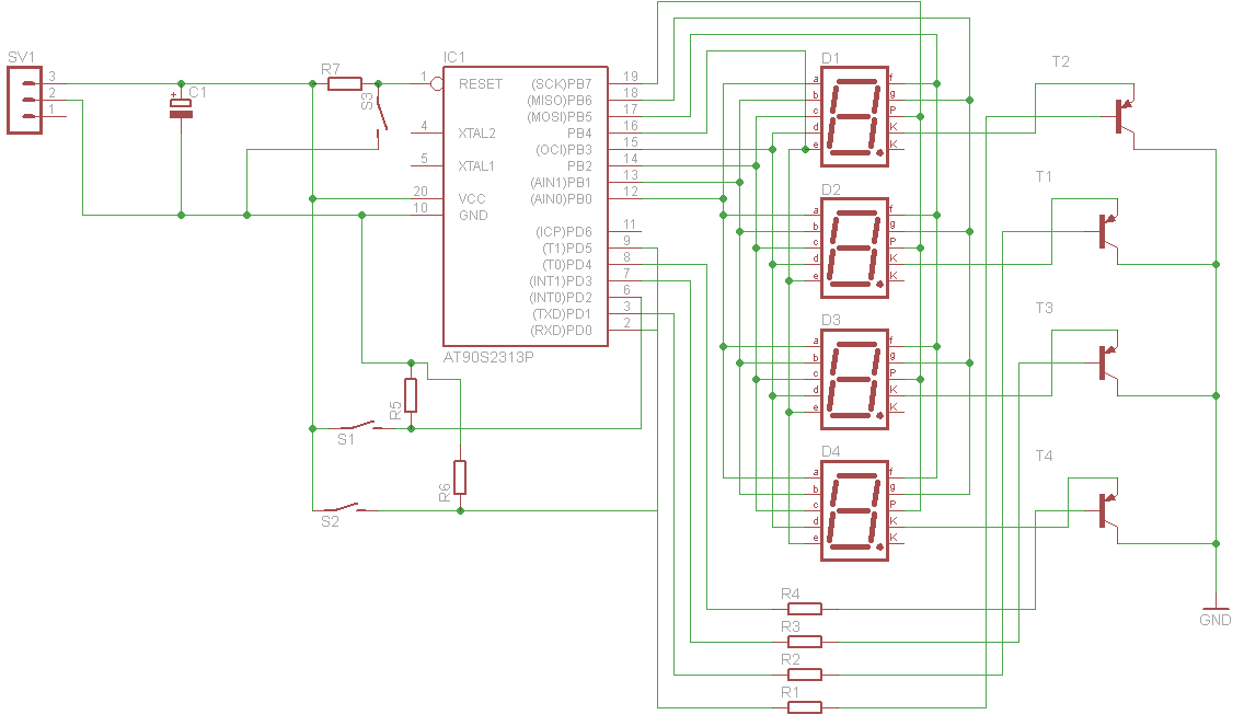 Ok, csatolom. Ez egy pont számláló (2x2 számjegyes eredményjelző) billiárdhoz :} Ez az első AVR-es fejlesztésem. Próbapanelen már megépítettem és jól működik. S1 és S2 lépteti felfele a játékosok pontjait, S3 meg a reset.
