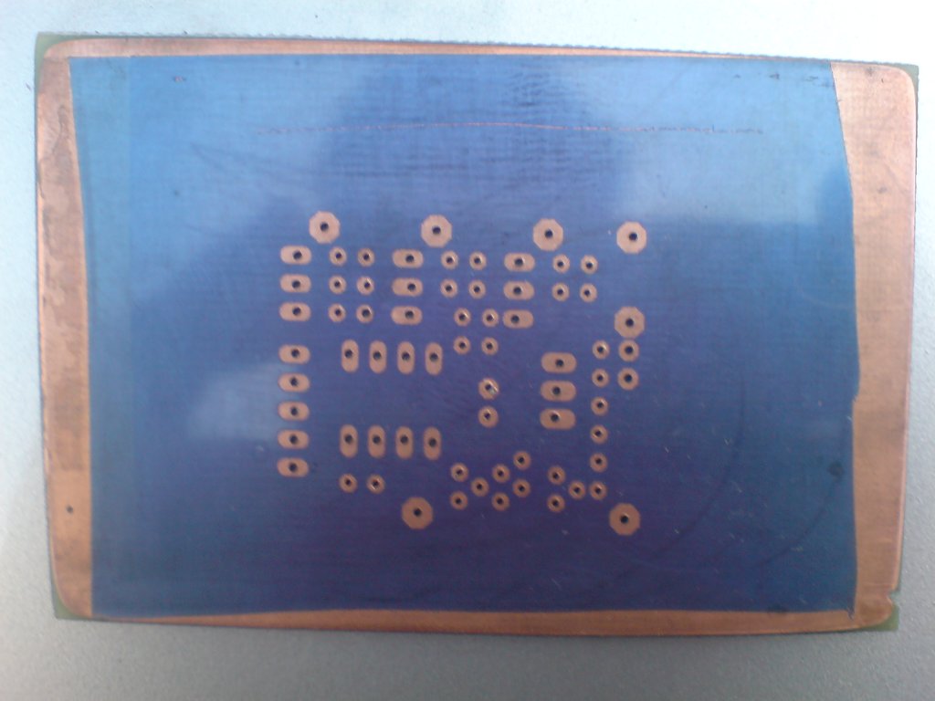 Készítési körülmények: Gyári (HQVideo) lakkozott nyák Samsung lézerrel nyomtatott fólia, oldalanként kettő. Scanner dobozba épített 3db BL fénycső Oldalanként 10 perc levilágítás (a gyári nyák bírja) NaHO előhívó (100g/500mL) Sósav+peroxid maratás Az ónozást mostanában ki szoktam hagyni, mert úgy tapasztaltam, hogy sokkal egyszerűbb forrasztani, ha alkoholban oldott fenyőgyantával kenem le. Aztán a végén ha kész akkor lelakkozom.