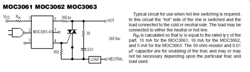 A MOC302X sorozat fázisfüggő! A felső ágba kell a fázist, az alsó ágba a terhelést és a 0-át kötni! Az ábrán látható kondenzátorok értékét be kéne tartani, talán még kisebbre venni, mert ha túlléped akkor az ilyen kis teljesítményű motor kisebb teljesítménnyel bár de röhögve forog, mert a feszültség és áram megkerüli a triakot. A két forgásirányú motor is egy 600 nanós kondenzátort használ a segédfázishoz és a 220V-os bekötéshez 110V helyett. A motorral sorba kötött ellenállás és kondenzátor tulajdonképpen előfeszíti a tekercset, így indításnál kisebb az áramlökéses terhelés, viszont a motor a triaktól függetlenül mindig feszültség és áram alatt van, legfeljebb még nem tud forogni.