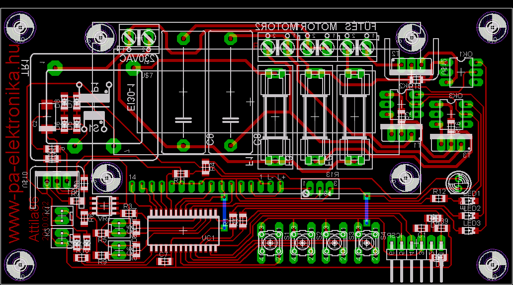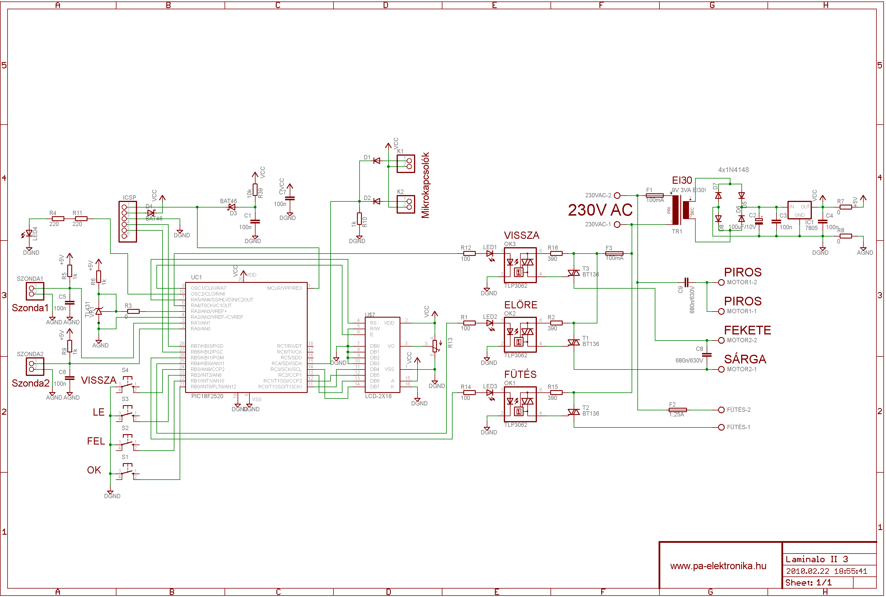 Most ott tartok, hogy elkészült a nyers terve annak a nyáknak, ami a gyári dobozba belefér és minden rajta van ami kell(motor lassú, gyors kapcsoló és szabályzó potik, fűtés hőfokbeállítás külső potival, belső trimmerrel(jumperrel választható), fűtés lekapcsolóval a kíméletes lehűtés érdekében(forog a motor közben). A 2 LED a gyári hely alatt van(kis eltéréssel), Olyan trafót választottam, ami befér pont(még tesztelnem kell bírja-e a terhelést!). A triakok(BT138) gyári ajánlás szerint szűrve. A kivitel olyan, hogy érintésvédelmi szempontból megfelel, azaz megfelelő szerelés után a véletlen áramütés kizárt. A laminálót lehet használni nyitottan és zártan is, ezt csak a szükséges hőfok határozza meg(130°C ig lehet zártan is használni(pl. az eredeti funkciónak megfelelően), felette le kell venni a tetejét, különben elolvad szerintem, de majd tesztelem! .)