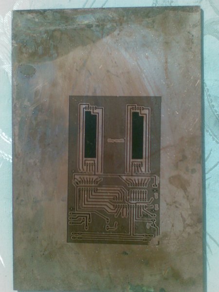 Ja egyébként kicsit fényt kapott a fólia, mert miközben a fiam gyártotta a panelt, a kicsilányom berohangált, jöttek vezérlőért, ott is nyitogatva volt az ajtó, mindeközben a méretre vágott fólia ott volt az asztalon, úgyhogy fellaminálás után tisztán látszott egy sáv ahol fény érte. Ennek ellenére a 3 perces levilágítás ezt annyira elenyészővé tette, hogy simán elő lehetett hívni, de azért vigyázzatok, mert ez a fólia sokkal érzékenyebb mint a p20, persze ennek az is az előnye, hogy nem is kell annyit világítani.