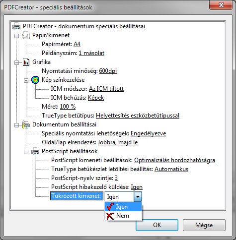 ![]() A PDFCreator - mivel ingyenes - valószínűleg eléggé elterjedt, már többször volt ezen a fórumon is szó a használatáról. Ha ez telepítve van a gépeden, bármely PDF kezelőben (pl. Adobe Reader, szintén ingyenes) megnyitod a kívánt PDF-et, és kinyomtatod a PDFCreator "nyomtatóra". A PDFCreator "Speciális beállítások" ablakában a Dokumentum... -> PostScript... -> Tükrözött kimenetet engedélyezed, ahogy a képen is látható, és az általad kívánt eredményt kapod. Természetesen átméretezés, forgatás, stb. nincs engedélyezve, így mérethelyesen fogod megkapni az eredményt, adott esetben már nyomtatható is - immáron valós nyomtatóval. Mellékelem az eredmény PDF-et is, amit így kaptam.