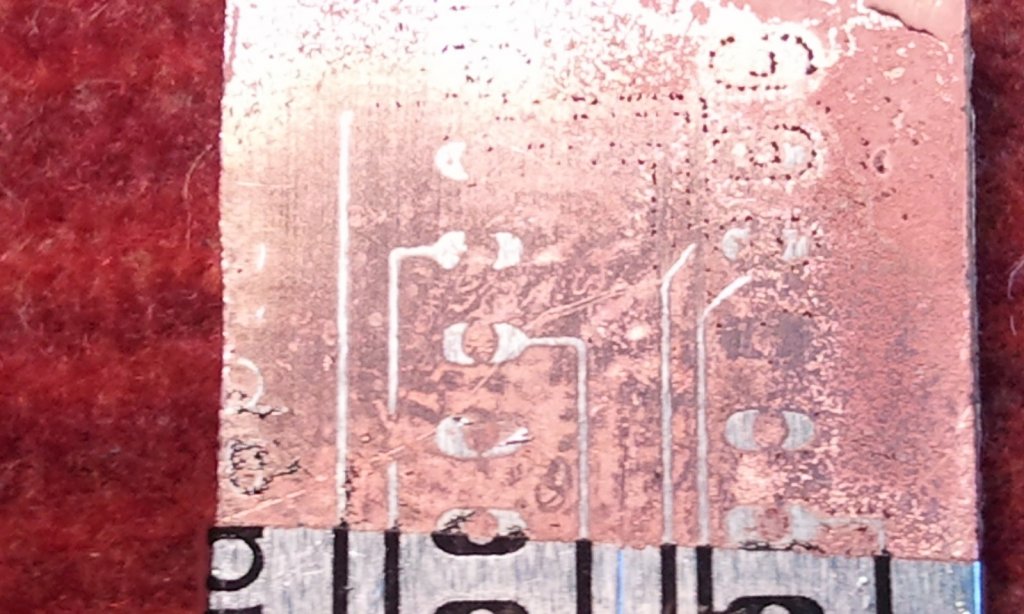 Némi retusálás és vaskloridos maratás után Polifag festékoldót találtam otthon (Kromofág néven is ismert), amit ablakfelújításhoz vásároltam valamikor. A lézernyomat vajként olvadt le tőle. Kissé megviselt a réz, az előző napi, tintás kísérletek miatt, de a célnak már megfelel. (Nem volt rendesen felpolírozva, mert azt hittem, ez is csak egy próba lesz.)