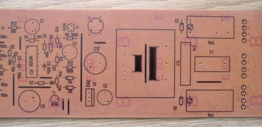 A maszk, lézerrel, írásvetítő fóliára, 1 réteg. Laminálás, Tescos laminálóval (1700Ft.) Levilágítás 30mp. Előhívás 1%-os mosószóda oldattal. Maratás majd legközelebb, mert a terv sem végleges. Eddig megvagyok elégedve a fóliával. |