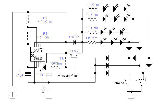 A sok dióda az vagy kapu(k): így az eredeti indexkapcsoló - ami egyáramkörös - elegendő és az elakadásjelzőnek is elég egy ponton talajt adni. Egy lényeges mod még: a PNP tranyó bázisát egy ellenállással segíteni kell a lezárás felé, különben ez nem biztos hogy megtörténik, mert az 555 ne megy fel a plusz tápra, de még ha felmenne is, ott van záróirányba a bázissal soros kijelző LED. A másik a bázissal soros ellenállás, ami egyrészt a LED-et, másrészt a tranyó bázisát védi, hiszen a log.nullánál a befolyó áramot nem korlátozza semmi más. Amit el lehet(ne) hagyni, az a BD-t "védő" dióda, amire ohmos terhelés esetén nincs szükség. P.S.: a betápot a talaj oldalon mindig az egyik diódán át adom, így semmilyen fogyasztás nincs ha semmi nincs kapcsolva.