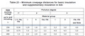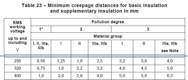 A szennyezettség fokától függően 3 csoport van. 1 - nem szennyezett, 2 - csak nem vezető szennyeződés, 3 - vezető szennyeződés. A levegő páratartalmát a kúszóút meghatározásnál nem említi, csak a tesztelés körülményeinél. Példa a mellékletben. Megerősített vagy kettős szigetelés esetén a táblázatban szereplő érték dupláját kell venni. |