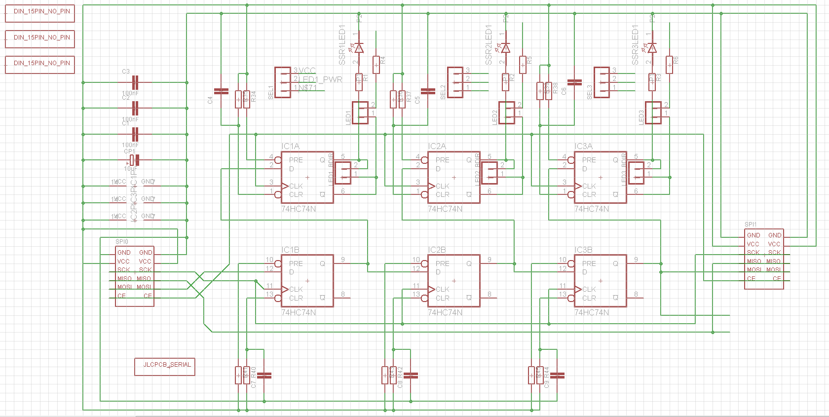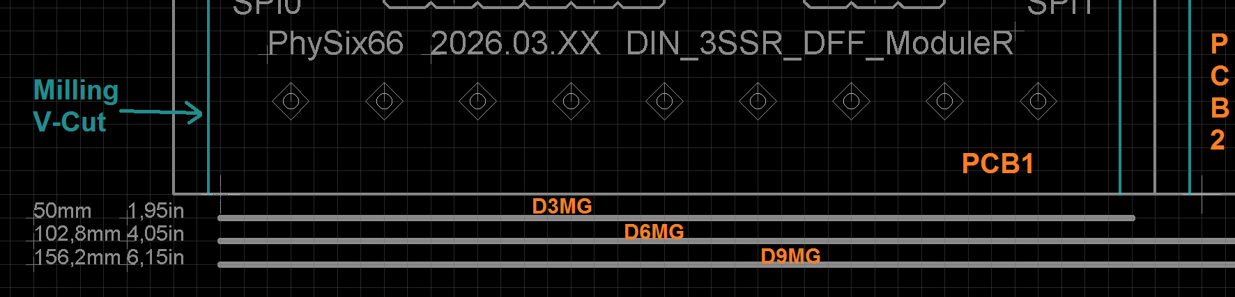 Moduláris DIN PCBÜdv!DIN-sínes műszerdobozba építhető PCB-t tervezgetek. Első gyors kérdés: Első sorban 24VAC-re szánnám, de mivel a tervezett SSR (AQHxxx széria) alkalmas nagyobb feszültségekhez is, így felmerült a kérdés benne, hogy: az adott rajz alkalmas-e 230VAC-re vagy túl közel vannak a sávok? (Max 1A terhelés/SSR pl lámpa) Első körben (elkapkodtam) egy D5MG-öst vettem alapul, de a tervezett felhasználásokhoz, hol sok, hol meg kevés. A D3MG viszont elgondolkodtatott. Pontosabban a nagyobb testvérei a D6MG, D9MG, D12MG. A fizikai méreteket a pcb-hez innen szereztem be. Az értékek mm-ről inch-be !!!megközelítőleg!!! átváltottam: szélesség: D3MG - 50mm - 1,95in D6MG - 102,8mm - 4,05in D9MG - 156,2mm - 6,15in A méretekkel stimmelnek? Elfogadható a hibahatár/tolerancia? A koncepció hogy csak a D3MG-hoz készíttetnék NYÁK-ot, így egy 5db-os rendelés esetén is építhetnék egy D6MG és egy D9MG-est. Szükséges kiegészítés a D3MG moduljához a "szárnyak". Ezek nélkül jó a méret D3MG-hoz, de ha egymás mellé rakok 2-t, akkor már kevés a D6MG-hoz. A "szárnyakkal" viszont D6MG-hoz már sok... lenne. Ezért vannak a V-Cut/Milling-ek berakva. Mérettől függően a szélsőket letörve (elvileg) megkapjuk a szükséges méretet. Kérdés: Így szimmetrikusan a jobb a V-Cut vagy legyen aszimmetrikus, csak az egyik oldalon? A rajzon a furatok csak irányadásra szolgának, beleértve a gyári furatokat és az általam "preferált" pozíciókat. Az SSR-ek ki- és bekapcsolását eredetileg egy MCP23X17-el oldottam volna meg. (Mint egy most is üzemelő megoldásnál.) Probléma ezzel, hogy az eredetileg tervezett D5MG-be épp bepréselhető lett volna, de a D3MG-asba már nem és persze felesleges is. Áttérhettem volna a MCP23X08-ra, de azzal is lenne egy kisebb "baj". A max kimeneti teljesítmény nem biztos, hogy elég lenne mind a 8 kimenetet meghajtani egyidejűleg. A serial adatbevitelt és így a bővíthetőséget is meg akartam tartani ezért egy pufferelt D-FF tárolón kezdtem agyalni. Így jutottam el a mostani megoldásig a 74HC74-as fip flop-ig. 20mA kimenetével bőven képes meghajtani az SSR-t és még akár egy ketős szinű LED-et (ON/OFF indikátor) is behelyezhető, opcionálisan. Szóval ez a kapcsolás, NYÁK terv mennyire elvetemült egy ötlet? SB