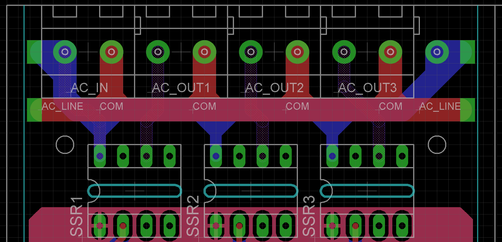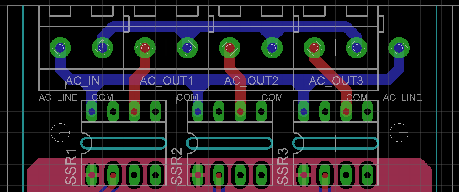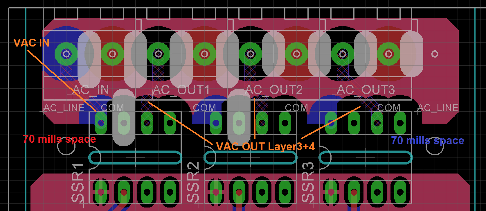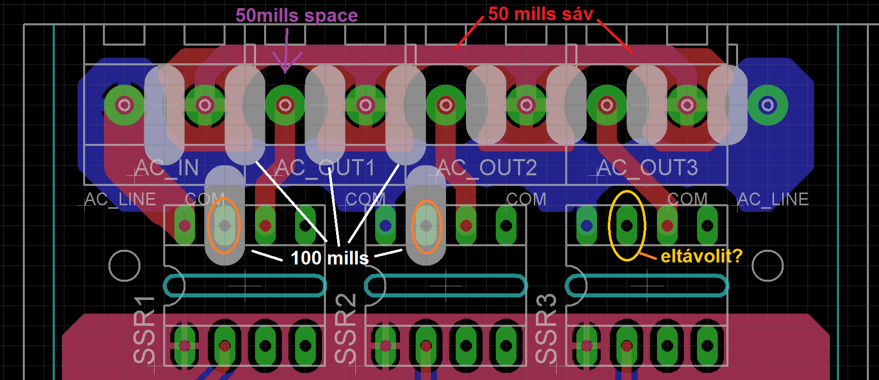 És akkor ilyen lenne 4 réteges NYÁK-on, miután az SSR-t sikerült lentebb csúsztatnom. Mindenhol megvan a 100mills (2,54mm).