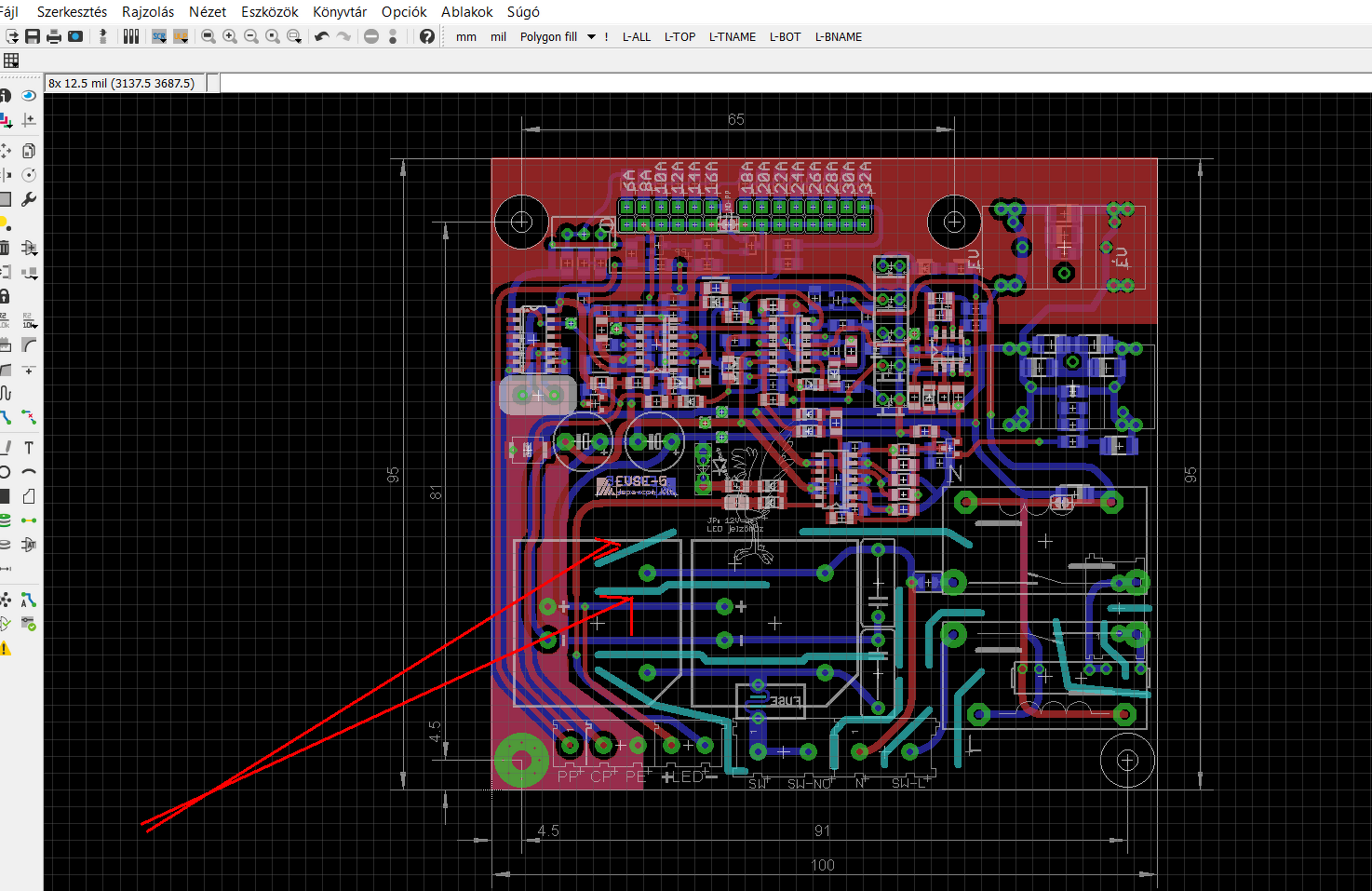 Idézet: „az adott rajz alkalmas-e 230VAC-re vagy túl közel vannak a sávok?” Nem javaslom. Emlékeim szerint a 230V-hoz az előírt távolság 7,5 mm, nálad ennek a harmada van, ha jól látom.