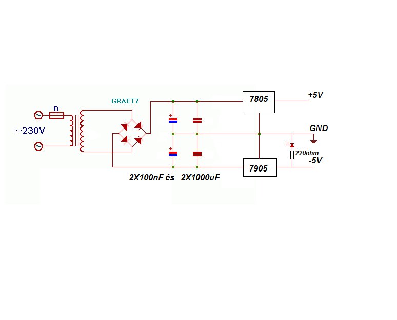 Ha helyre kerülnek a kötések, akkos is csak látszólag lesz +/- 5 V, mert a negatív oldalt alig lehet terhelni. Ezt is célszerű figyelembe venni.