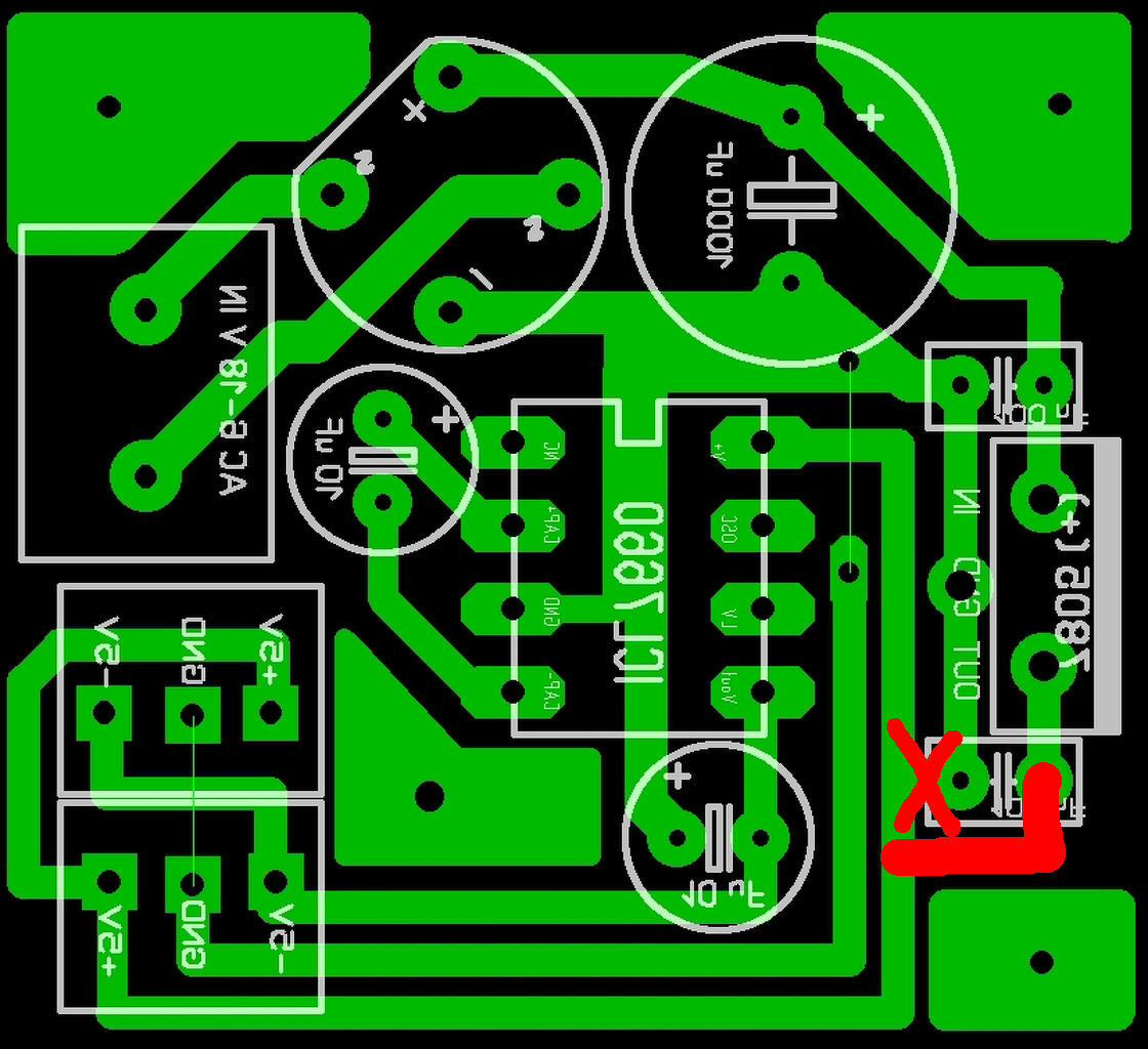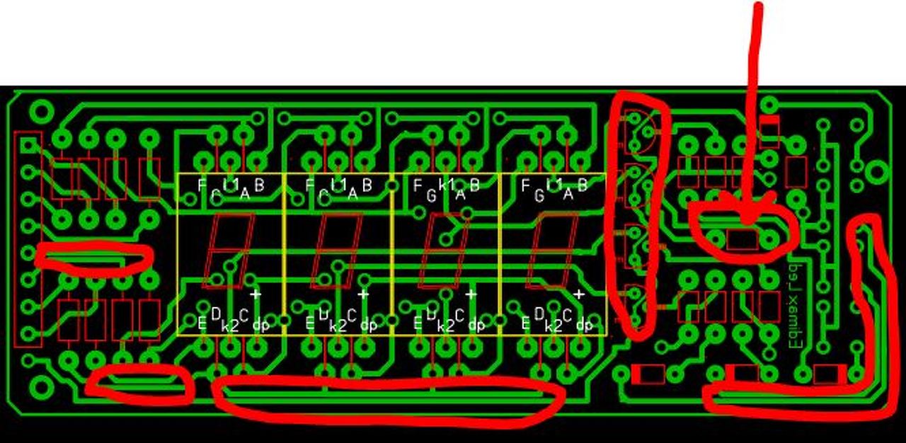 A Pirossal bekarikázott részeknél nagyon közel vannak a vezetők egymáshoz, még egy nyákgyár is vakarná a fejét A legjobb ha úgy csinálod hogy amilyen vastag vezetővel vezetsz ugyanannyi szigetelőt hagysz 2 csík között. A nyíllal jelölt helyen pedig csak egy hajszálnyi a távolság amit már nyákgyár se tudna megcsinálni nem hogy házilag bárki. 2. képen az ahogy szerintem jó lenne,de itt el vannak forgatva az alkatrészek.