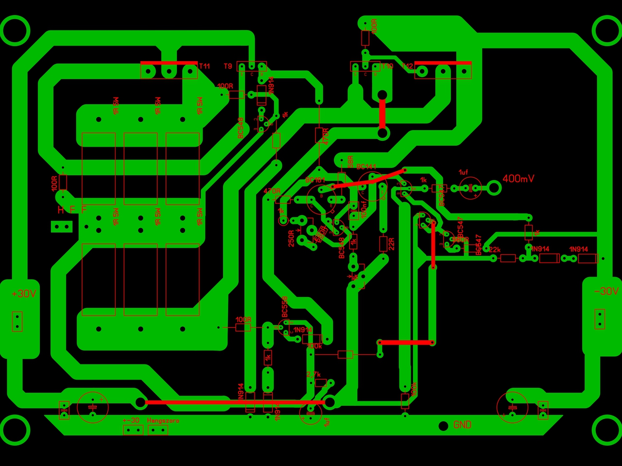 Ugyanis az első bekapcsoláskor kb a fele vezetősávod leolvad. Az összes BD tranyónak ugyanazon a hűtőbordán kell lennie. Az 5W ellenállások kb 3X ilyen hosszúak és legalább 5X ilyen szélesek, ráadásul ott nem hinném hogy 100W nál csak 3A folyna amikor 10A-es biztosíték védené. Ezeken kívül miért van bezsúfolva minden a bal felső sarokba amikor a nyák jobb alsó fele full üres?