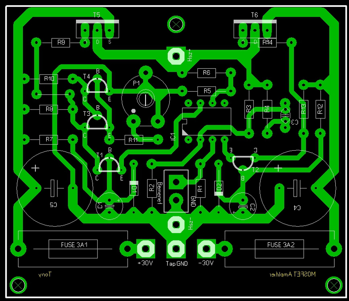 Régóta szemezek ezzel a kapcsolással és szeretném megépíteni. Egyszerű, kipróbálnám. Nyáktrevet sem találtam így magam készítettem. Erősítő technikában (is) jártas szeműek véleményét szeretném kérni (főleg) a nyákkal kapcsolatban a FET-es kapcsolást szem előtt tartva. Kétféle verziót is készítettem. Nyák tervezéskor a főbb szempontok: - FET Gate-re a lehető legrövidebb úton csatlakozzon az ellenállás - közepes és közel egyforma alkatrész sűrűség - a +/- táp bevezetések fóliahossza egyforma - a hangszóró kimenet + (HSZ+) fóliahossza egyforma a FET-ektől - T4 (természetesen) a hűtőbordán foglal helyet huzalozással - jól átlátható, kompakt egység (némi szimmetriával) A kapcsolási rajz mellékelve. Előre is köszönöm.