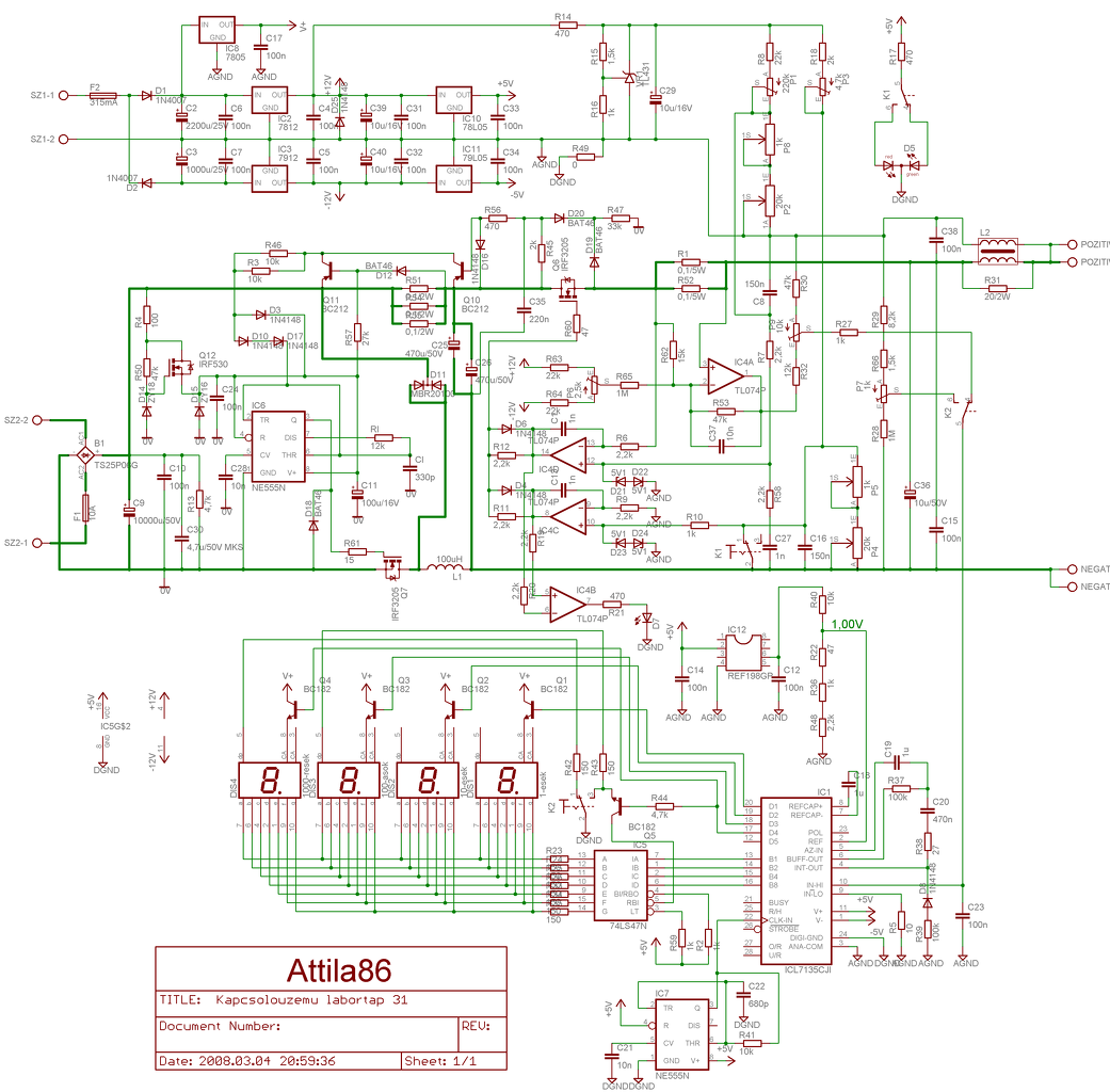 A kapcsolási rajz nekem ott se jön be. De őszinte leszek.. nekem a "gyári verzió se tetszik, főleg az ic lábak között feleslegesen cikázó vezetők.. Sok helyen teljesen feleslegesen.. A te verziódnál például a+- 5 voltos résznél a test nem megy tovább. A - ág felett a 2 zavarszűrő kondinál megszakad. A kijelző feletti vezérlő tranyók bázis vezetékei az icnél teljesen feleslegesen bujkálnak az ic lábai között, mivel a kijelző felett úgy is átkötésekkel van megoldva, ezért mehetnének szépen sorba is.. De ez is csak az én véleményem. Ugyanilyen elgondolásból szerintem a kijelző lábai között bujkáló vezetők is feleslegesek ha már az egyik fele úgy is átkötésekkel van megoldva még 2-3 simán beleférne és akkor a nyákot egyszerűbb lenne legyártani..