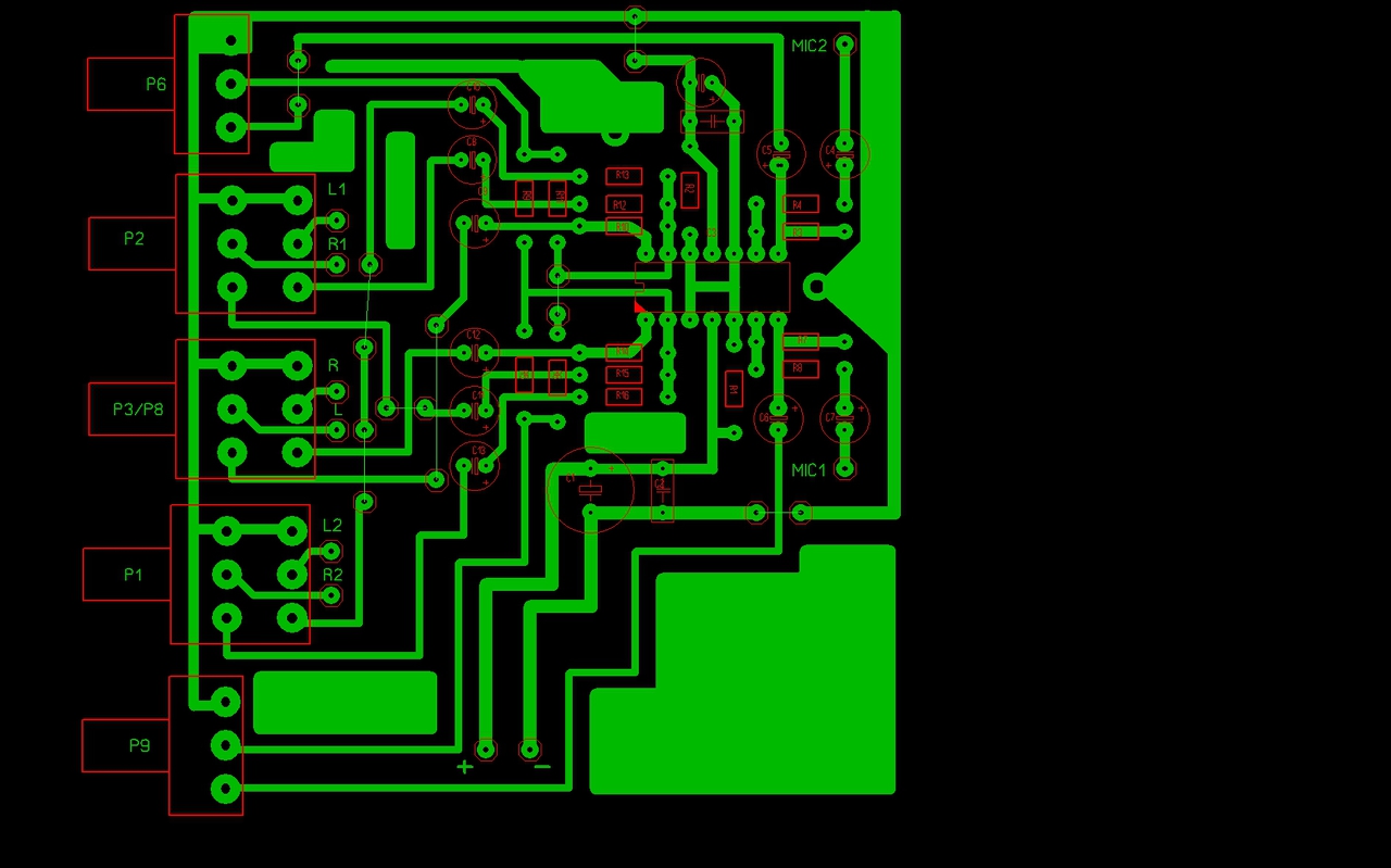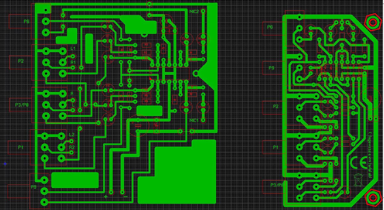 Nagyon sok alkatrésznél van plusz egy forrszem valamelyik lába mellett, kicsivel arrébb téve, ami miatt dupla furat van azoknál a lábaknál. Pl: balra alul, 120R és 3k3 jobb oldali lába. Ha a T3 helyén PNP tranzisztort használnál (BC558B), akkor nem kellene ilyen kacifántosan vinni a lábaira a csatlakozásokat, mert azt fordítva kell az áramkörbe tenni, akkor a kollektora megy a T4 -re. Több vezetősávnál a mellette lévő forrszem túl közel van, pl. legalul, a GND csatlakozás feletti két vezetősávnál az alsó sáv és a felette lévő forrszem között csak 0,17mm a távolság. A kimeneten lévő Zobel-tag (R20, C9) vígan elférne állítva, a trimmer jobb oldalánál lévő üres helyen. A GND vezetősávja túl vékony, így nem sok értelme van a végtranyók melletti 100nF -os hidegítő kondiknak. A végtranyók lábainál kb. 1mm széles a forrszem, azokat ki lehet nyugodtan szélesíteni. Nézd meg egy népszerűbb végfok bevált topológiáját, pl. a VF2, vagy az ST151 -ét. A GND, tápfeszültség és kimeneti pontok helyét azokról kellene lemásolni. A kapcsolás sem a legszerencsésebb, én meggondolnám a helyedben a 4 Ohm -os használatot. Túl nagyok az emitter ellenállások, 4 Ohm esetén a kimenő feszültség (kb. 35V csúcsban) 1/5 -e rajtuk marad. Az 7V, ennyivel kevesebb a kivehető teljesítmény, ez csak az ellenállásokat fűti (csúcsban kb. 50W). A hozzászólás módosítva: Márc 6, 2016
