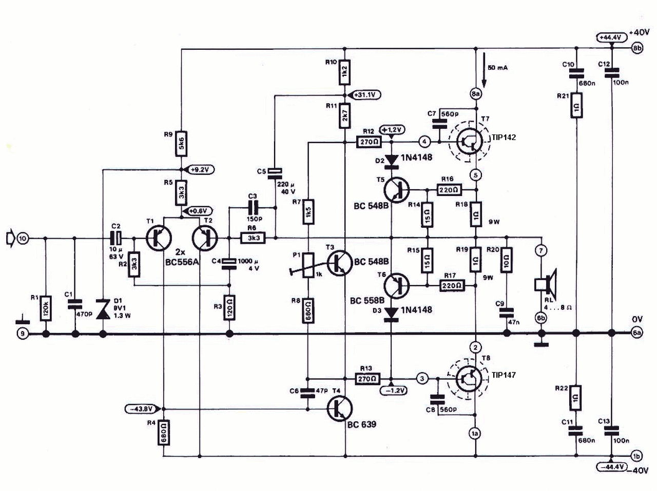 Csak a rajzot látom, mert mobilról írok, a nyugalmi áramot állító kör nem jó ebben a formában. Később, idővel mikor kontakt hibás lesz majd a potméter, elég egy apró mozdítás és úgy megugrik a nyugalmi áram, hogy csak az áramkorlát fogja korlátozni, akár a végtranyók is tönkremehetnek miatta. A trimmert kösd be változtatható ellenállásnak (bal széle és a közepe összekötve), tedd így be a bázis -emitter közé, sorban egy 820 Ohm -os ellenállással, a bázis és a kollektor közé pedig tegyél be egy 3,3 kOhm -ot. A hozzászólás módosítva: Márc 6, 2016