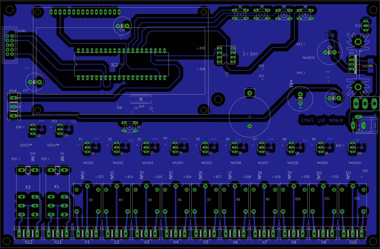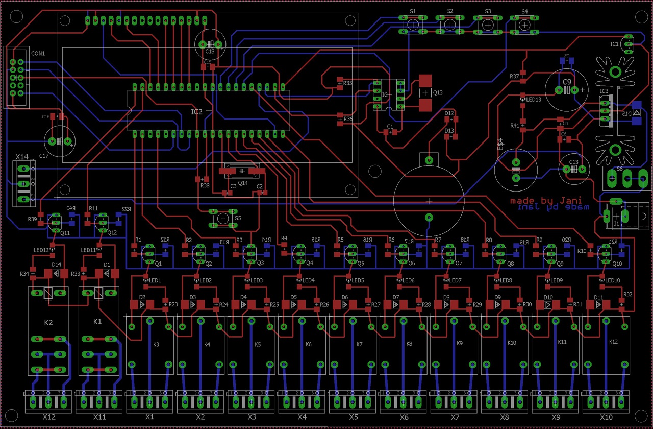 Sziasztok elkezdtem megtervezni a relés ,osztós bemenetválasztómat.Szeretnék minél többet vezetékelés nélkül megoldani amennyire lehet.Eddig itt tartok.Remélem jó még csak az erősítők és a táp van meg.Ha valaki hibát lát kérem szóljon.KÖSZI!