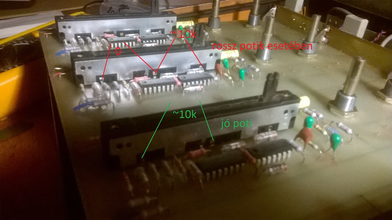Az a helyzet, hogy az 1-es csatornán 14k körülit mérek, a 2-es csatornán 110k körül, a 3-ason (10k, ez a jó csatorna), a 4-esen 20k körüli értéket. Kiműtöm a potikat, megnézem a hátukon milyen értékek vannak feltüntetve.