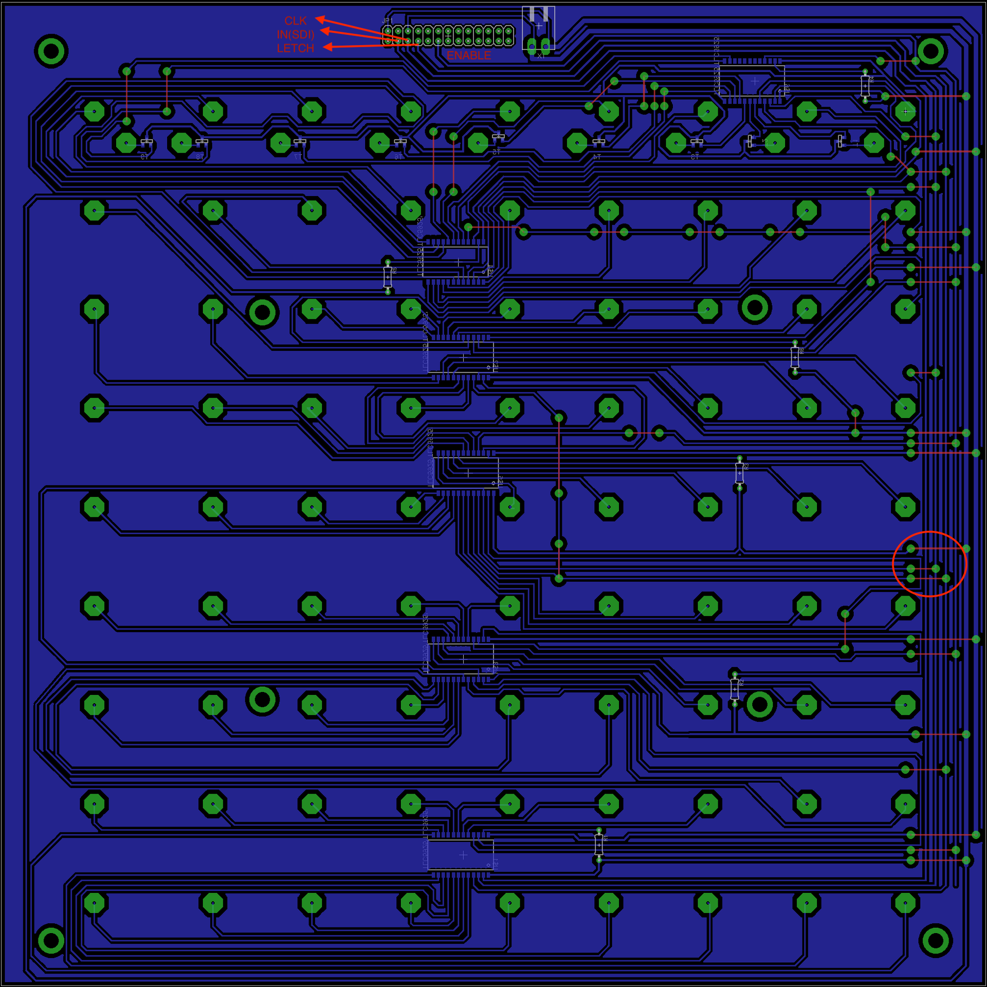 A téli pandémia idején elhatároztam, hogy rendbeszedem a szakdoglozatomat ami egy LEDKocka alapú projekt volt még 2015 -ben. Nem kevés időm ment el vele és már csak egy dolog maradt így a végére, mégpedig az hogy van egy áthallásos hibajelenség a NYÁK -n, ami valószínűleg tervezési hibából adódott(mérnök infót végeztem, nem sok tantárgyam volt nyáktervezésből), de szeretném ezt is valahogy kijavítani, ezért arra gondoltam feldobom ide, reménykedve abban hogy tapasztalt fórumozónak egyből bevillan a hiba forrása. ![]() A jelenség, hogy az esetek 90% -ban működik, de a maradék 10% -ban előfordulnak anomáliák, pl egy adott ponton 5. emeleten a 12. led nem világít csak ha megérintem a körrel jelzett ponton, illetve máshol gyulladnak fel a ledek, de érintésre megjavul. Valószínűleg nem volt okos ötlet a CLK -t az SDI mellett vezetni de ez annó így jó ötletnek tűnt. AZ IC -k TLC5925 -k, fentől a második sorban az emeletek vezérlőszálai vannak, a többi a sor/oszlop. Meg ami mögötte van: https://cleversolutions.hu/electro.php?id=82