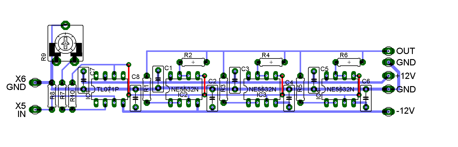 Ez a körbevitt GND rossz megoldás. A középső két IC tápja gyakorlatilag nem ugyanoda van hidegítve, mert a kettő közötti összekötés körbemegy a fél panelen. A nyáktervet a táppal kellene kezdeni. Pl. az IC-k alatt középen végigvinni a GND-d, és ehhez rövid úton bekötni az IC-k tápját hidegítő kondikat. A ±táp végigmehet lent és fent. Minden egyéb utána jöhet...