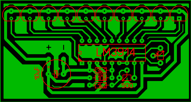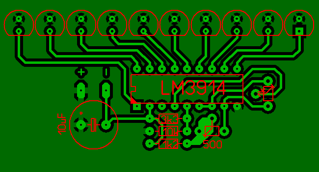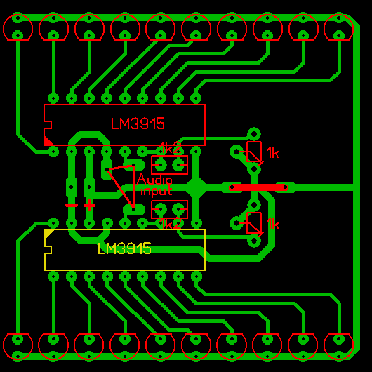 Még valami. Építenék egy sztereó kivezérlésjelzőt, és csak a mono-n tudtam eligazodni (Bővebben: Link)Én megcsináltam duplán, és megterveztem a nyákot. Az alsó IC ALULRÓL lesz beforrasztva, mert így egyszerűbbnek tűnt. Legyetek szívesek átnézni! Köszi!