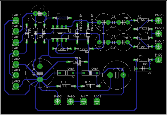 Ha csak az egyik oldal kell, akkor miért nem használsz dual opa-t, nem kell a quad. A kondik sem ilyen böszme nagyok és az ellenállások lábtávolsága is kisebb, ha 0.6W-osat használsz. Sokkal kisebb helyen elférne minden.