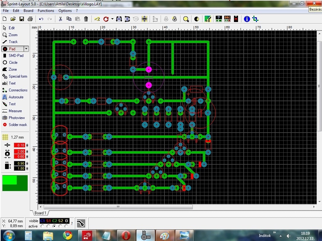 Valahogy így kezd el a nyákot, a rajzot utána ki lehet kapcsolni és lehet rakosgatni az alkatrészeket tetszés szerint. A zöld vonal azt mutatja,hogy minek hova kell vezetősávot csinálni.