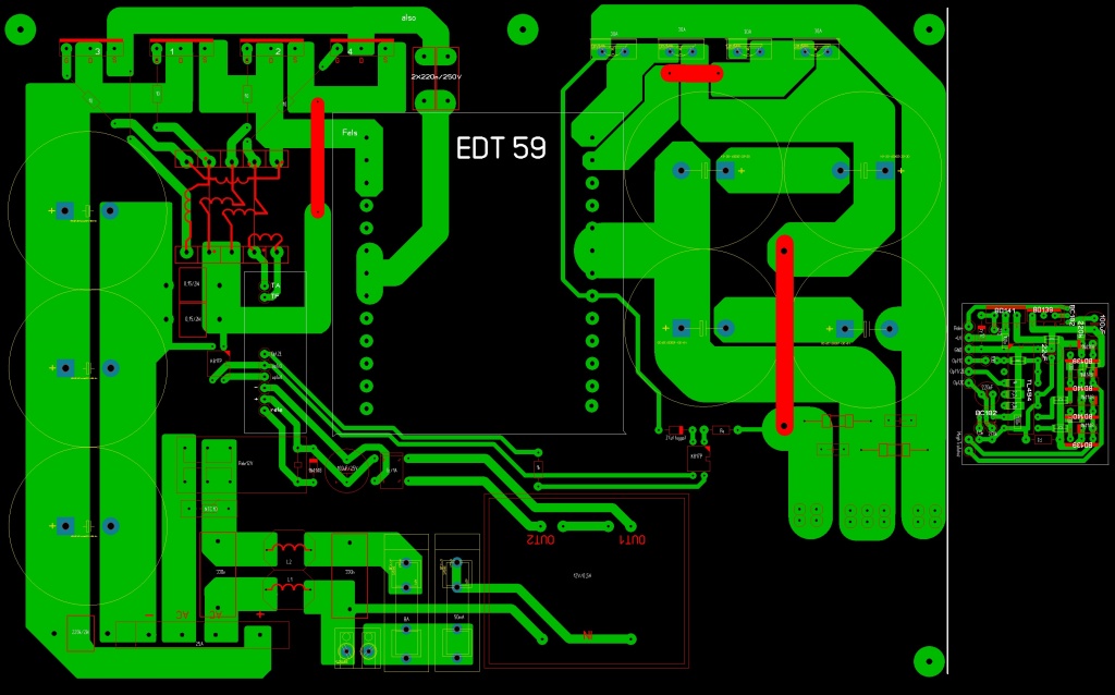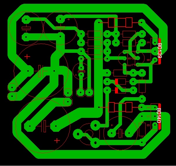 Először helyezd el úgy a végtranzisztorokat, hogy kényelmesen tudd a hűtőbordához fogatni. Innen visszafelé pakold fel szellősen az alkatrészeket ahogy a rajzon is elhelyezkednek. Rendezd valamennyire pofásra az alkatrészhalmazt. Most lehet a vezetősávokat berajzolni, szintén a végtranyóktól kiindulva. Közben változhat az alkatrészek helyzete, az egyszerűbb sávkialakítás érdekében.