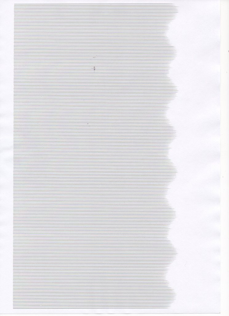 Te most ezt rányomtattad az előző tesztlap hátuljára? Jól bevittél az erdőbe, agyaltam mire rájöttem. Én a lézerhibát kilőném, ahhoz nem elég kontrasztos az átmenet, persze egy tükörtisztítás nem árthat, mert ahogy pörög a motor be tud koszolódni a prizma egyik széle, ezért a lap egyik szélén kihagyhat. Viszont amit látok, hogy ismétlődik hullámmozgésszerűen, le kéne mérni a távolságot és megnézni minek van ilyen átmérője. Idézet: „alaposan kitakarítottam vízzel is” Meg kéne nézni a transzfer rollert, remélem nem vizezted be, mert az nehezen szárad ki, mivel szivacsos. Szerintem mérd le az átmérőjét (alul van a nyomtatóba, fekete hengeres izé, ennek a tetejére jön a kazetta) Vagy nézd meg a kihagyás felöli oldalon lévő rugó rendben van-e, mert ha nem nyomja oda a papírt a dobhoz, bizony kihagyhat. Üdv szerk: Ja és a szkennered üvegét meg töröld le, az a folt középtájékon szintén megtévesztő tud lenni! A hozzászólás módosítva: Aug 18, 2013