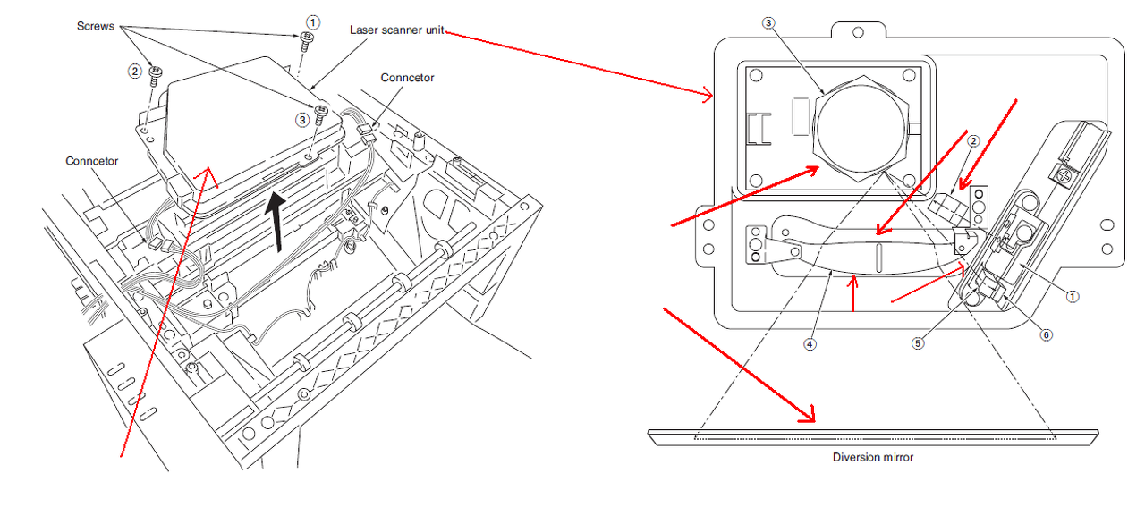 A laser unit , ami a lényeg az abban lévő tükröket , forgó egység tükreit stb megtisztítani , mert tuti , hogy poros , vagy homályos , így fals lézer fényt továbbítanak , ami később meg is látszik a papíron. A tisztítást száraz nem szöszölős ronggyal csináld vegyszert ne használj ne ,hogy megmarjon valamit is .Bejelöltem nagyjából , hogy hol vannak azok a részek amiket tisztítani kellene . Utána meglátod mintha kicserélték volna olyan lesz.