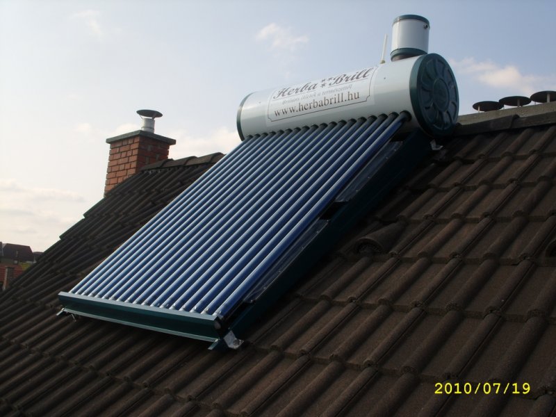 Tegnap lettünk készen egy napkollektor szereléssel. Öcsémmel ketten vettünk egy Grünpower napkollektort, 160 literes tartállyal 18 vákuumcsővel. A gyárilag mellékelt rögzítőelemeket (mint a műa. tipli) szakmai szemeim kétséges terhelhetőségűnek vélték, így nekiálltam ledaraboltam 4 sarokvasat, kifúrtam és rögzítettem a kerethez. 2 napos megfeszített munkával sikerült felvinni a tetőre, kifúrni az elátkozott Bergmann betoncserepeket és lerögzíteni 16-os menetes szárral, mindezt egy >45°-os tetőn kb. ugyan ekkora hőségben. Az üvegcsöveket szappanos vízzel ajánlotta a gyártó benedvesíteni, de ettől még úgy tapadt, hogy nem tudtuk a tartályba tolni, a megoldást végül a JAR mosogatószer jelentette. Nagyon röviden ennyi, a szerelvényezésről még teszek fel egy pár képet, illetve előljáróban annyit, hogy majd lesz lehetőség egy részletes beszámoló keretében a részleteket is megnézni, ötleteket meríteni... Idézet: „a megoldást végül a JAR mosogatószer jelentette.” A JAR-al jobban jár. Szép munka! Engem nagyon érdekel, hogy télen mit tud, illetve hogyan tudja tárolni a hőt télen.