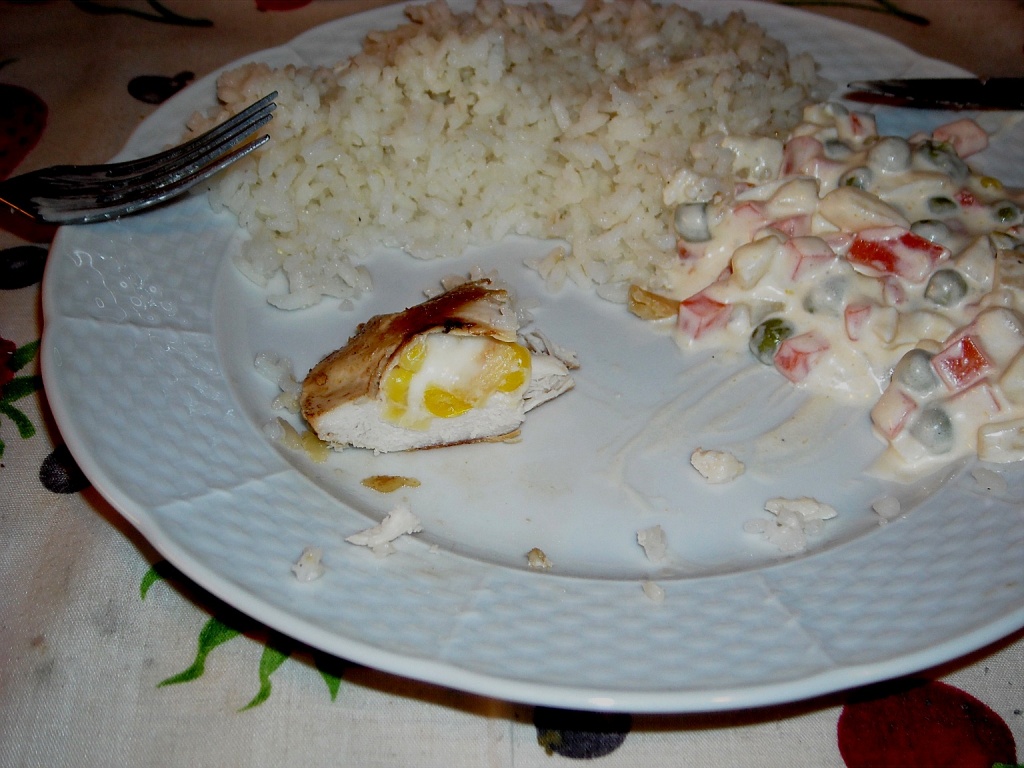![]() Kipróbáltam a szuvizálást otthon. Mondhatom, nem csalódtam, nagyon elégedett voltam a végeredménnyel. Csirkemellet töltöttem meg. Az egyik felét füstölt sonka csíkokkal és sajttal, a másikat kukoricával sajttal és petrezselyemmel. Hozzá egy kis rizs és franciasali került. (természetesen a salit is én készítettem) No, de beszéljenek a képek. Ugye, hogy guszta?