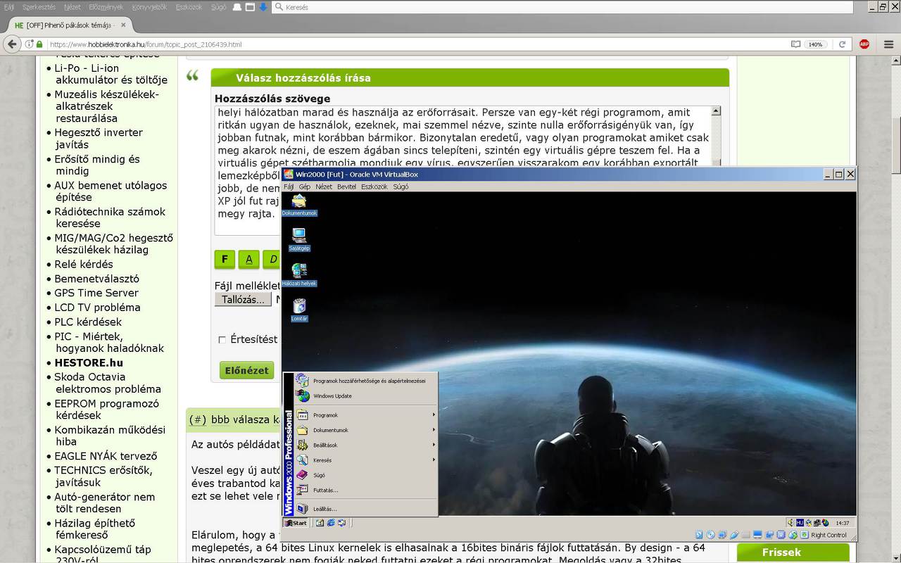 Nekem pl. a virtualbox nagyon nem jött be. Volt két nagyon régi szoftverem amikre átmenetileg szükségem lett volna (az egyik egy őskori nyáktervező, a másikra nem emlékszem), xp-s gépen működtek, de a gépemen virtualbox alatt el sem indultak. Az ilyen meg az LPT-s dolgokra most van egy IBM T43-as régi laptopom xp-vel, ezen működnek.