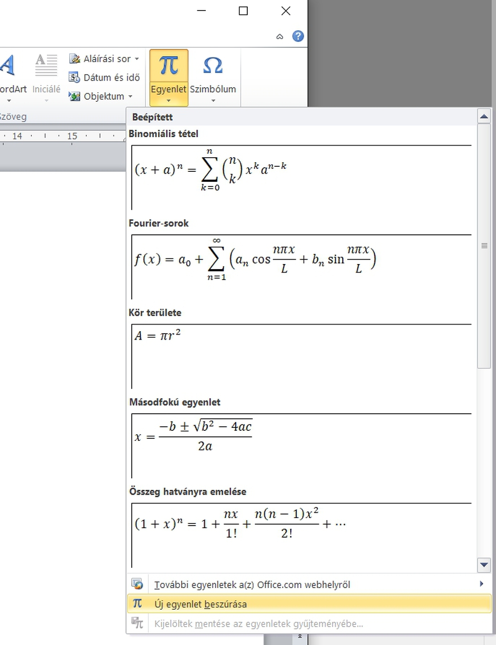 A szimbólum az nagyon egyszerű, mert rámész az ikonjára, és ott egyből találsz egy csomót -amik egyébként az utoljára használtakat mutatja-, de ha nincs közte ami kell, akkor a teljes választékot eléred. Jó tudni, hogy ha a betűtípust változtatod, akkor megváltozik a szimbólum is. A képlethez már kell némi hozzáértés, de az is megszerezhető 4-5 perc alatt. Ehhez az egyenlet ikon kell, és ott az új egyenlet. Addig kell eljutni, hogy felül a menüsor végén megjelenjen a képletszerkesztő. Ezt értelem szerűen használva gyakorlatilag minden matematikai összefüggés leírható. Nekem nem volt benne minden logikus, de gyorsan kiismerhető és hatékonyan használható. (A kivágások egy World"sok" verzióból vannak, de a mintaoldalt jó pár éve csináltam, tehát ezek a régiben is ott voltak már.) A hozzászólás módosítva: Nov 5, 2017