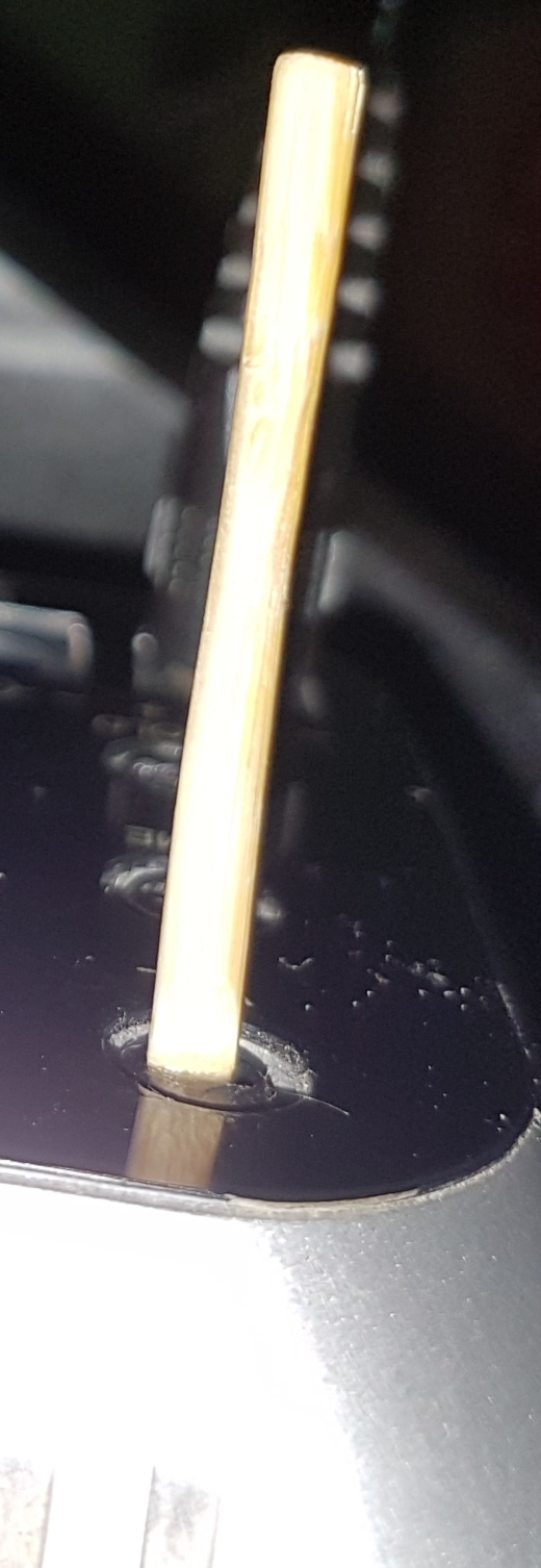 @bbb ‒ Kissé túlgondoltam. Megcsiszolgattam az egyik végét egy kis szakasz hurkapálcának, hogy belemenjen a lapos csavarhúzónak való vájatba, becsöppentettem pillanatragasztót és belenyomtam a hurkapálcát (kép). Ez egyelőre jó lesz.