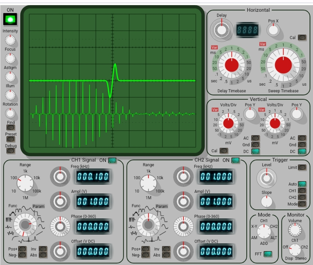 Szokásos szkóp/jelgenerátor/spectrumanalyzer funkciók, XY, trigger, delay, xmag, readout, cursor. Tekerők: egérgombbal vagy drag up/down, ráklikkelés: resetel, hosszú klikk: pull.